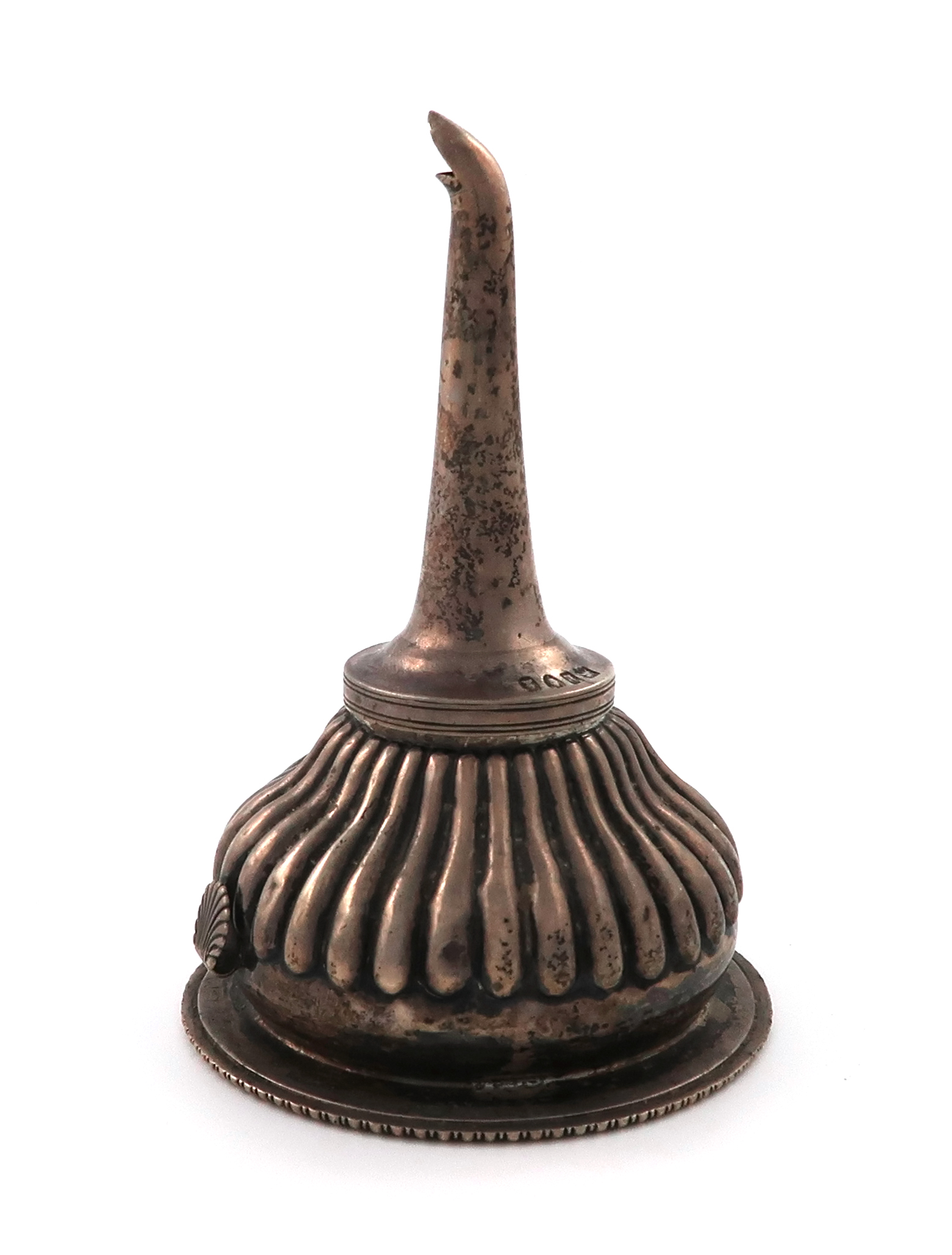 circular fluted form, gadroon border, with a shell side clip, tapering spout, lacking straining section, length 14.5cm, approx. weight 5oz.
