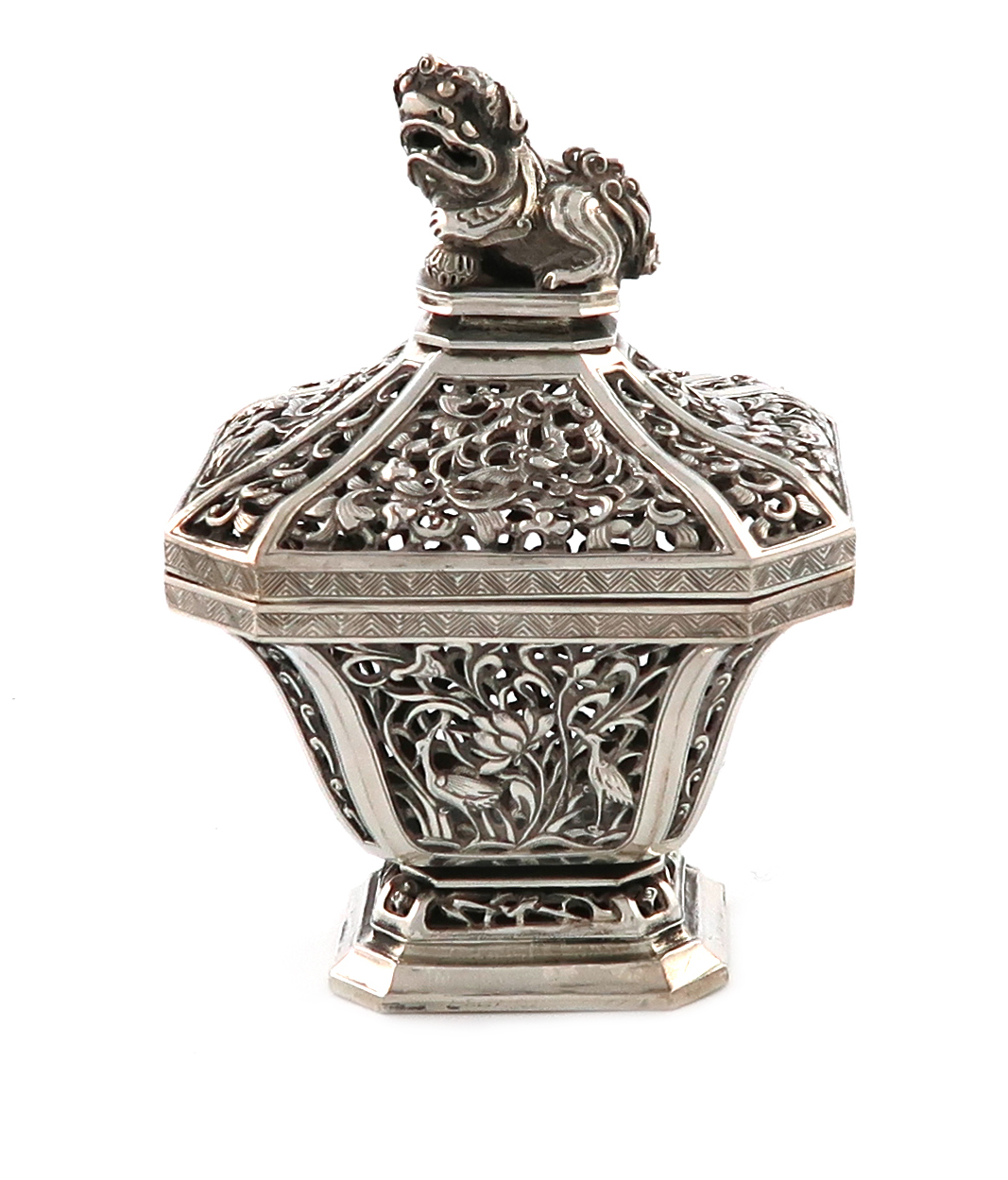 rectangular tapering form, pierced with foliate decoration, the pull-off cover with a Chinese Guardian lion finial, on a rectangular foot with canted corners, height 10cm, approx. weight 4.4oz.