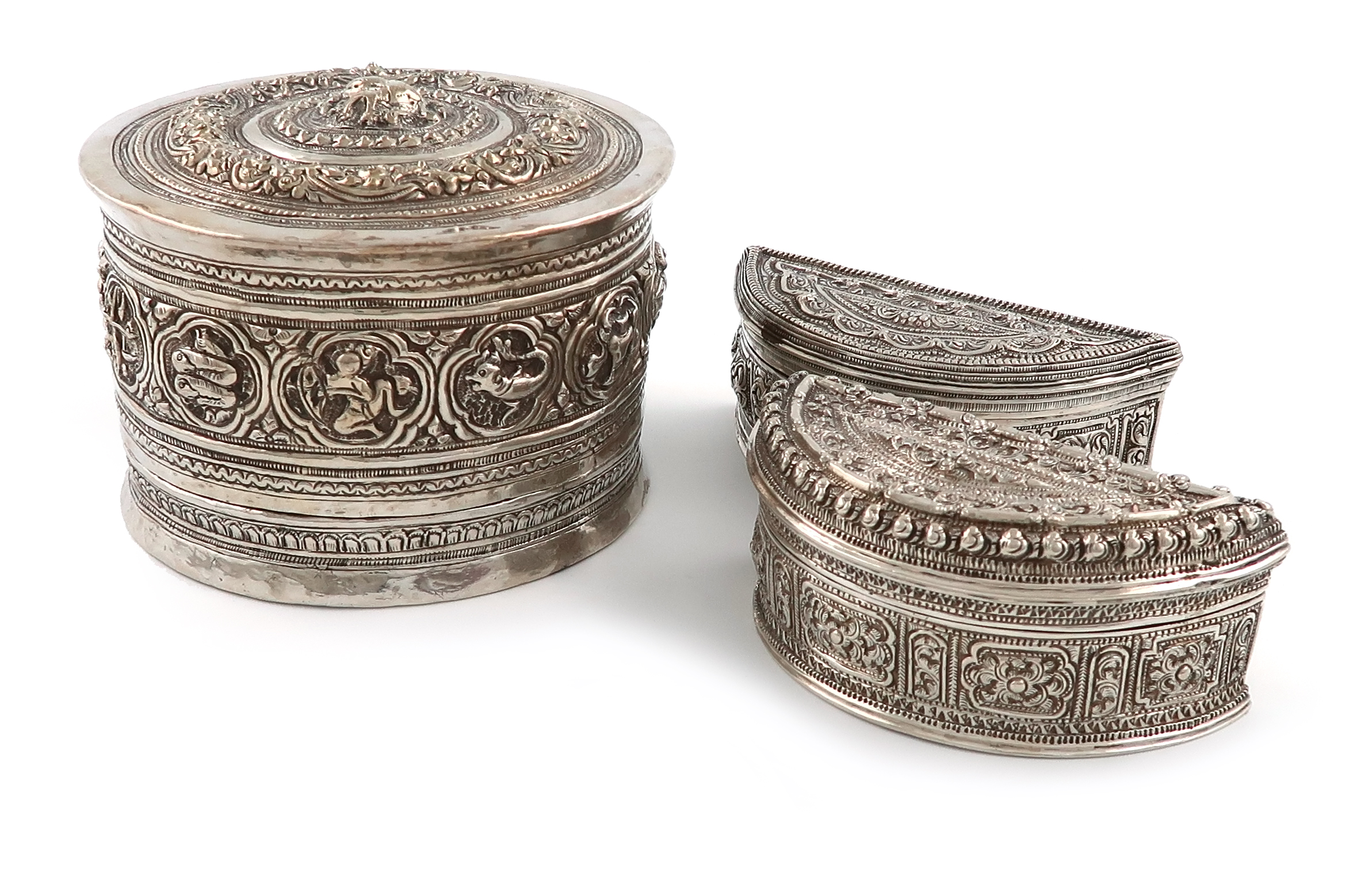Three Burmese silver betel nut boxes