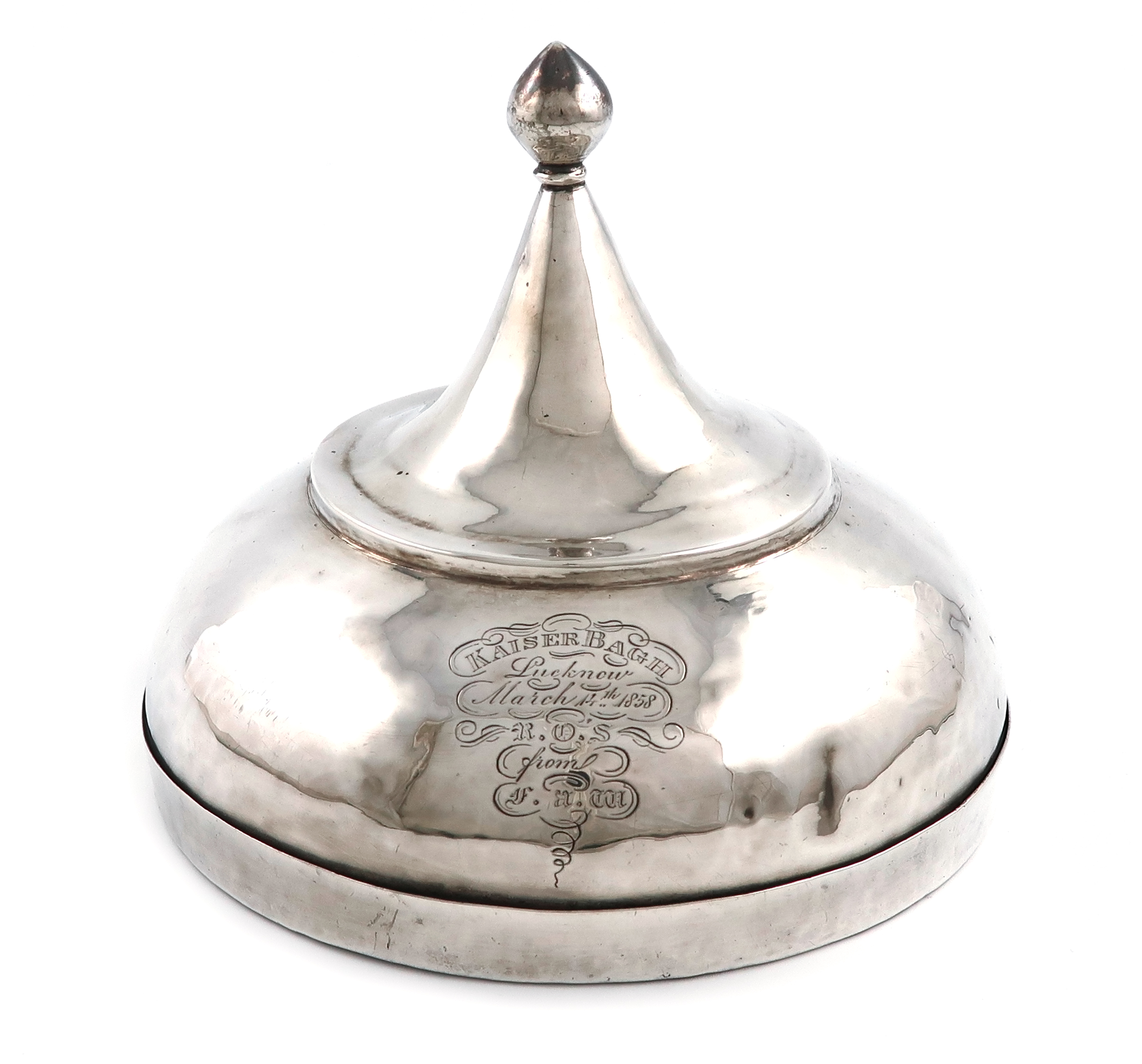 circular form, raised cover with a pointed finial, the front inscribed ' KAISER BAGH, Lucknow March 14th 1858, R.O.S from F.A.W', diameter 16.8cm, approx. weight 13.5oz.