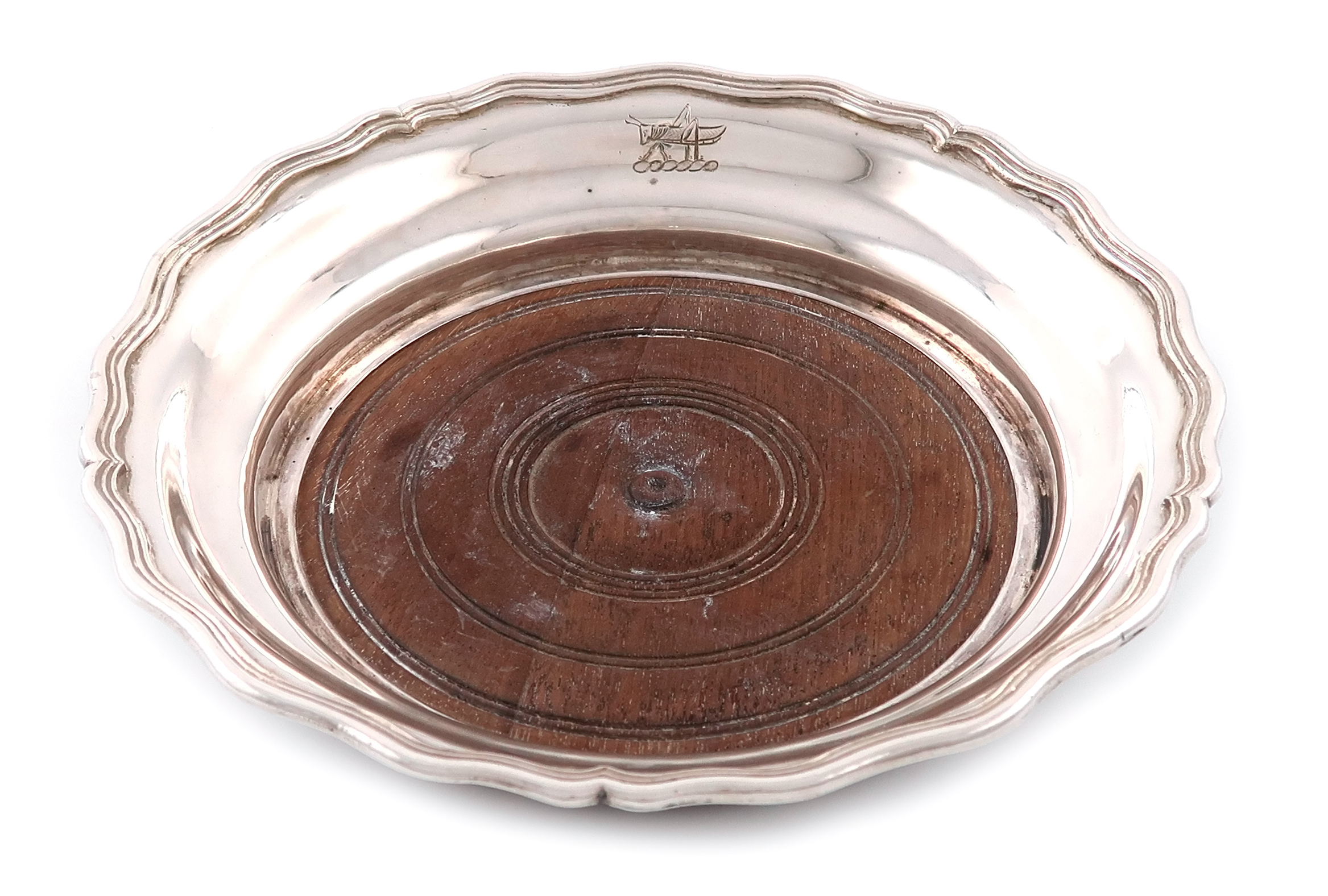 shallow circular form, moulded border, and engraved with a crest, wooden base, diameter 17.8cm.