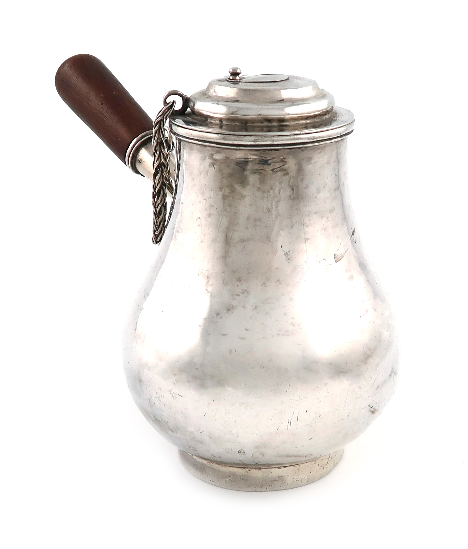 baluster form, the pull-off cover with a swing-action hinged cover for a molinet, with a chain attachment, turned wooden side handle, height 21cm, approx. weight 33.5oz.