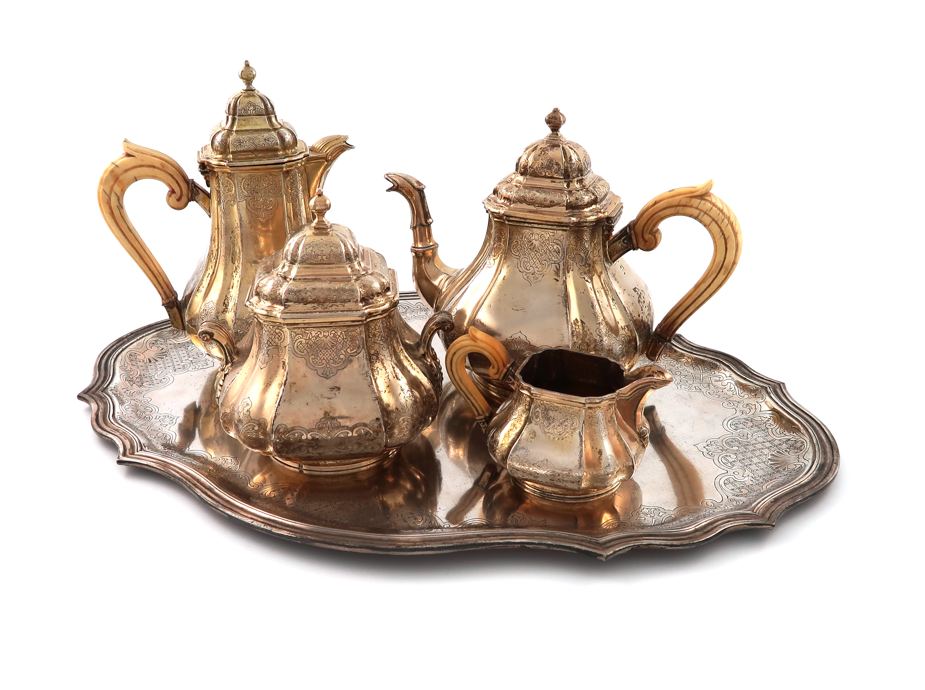 λA 19th century French silver-gilt tea set and tray,