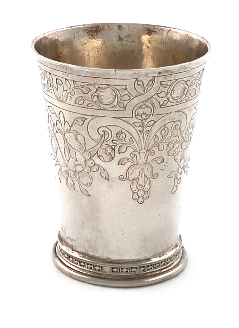 tapering circular form, engraved with flowers, fruit and scroll decoration, on a circular foot, height 8.3cm, approx. weight 2.9oz.