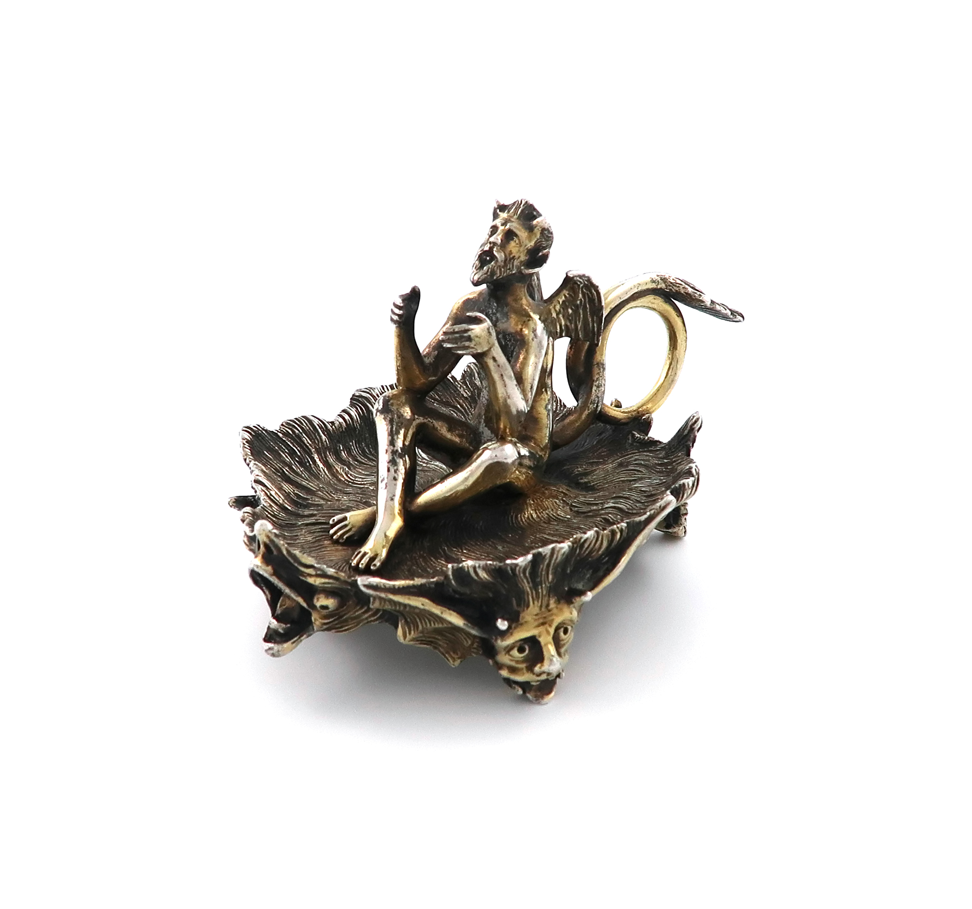 modelled as a seated devil with arms out to hold a candlestick, his tail forms the ring handle, the shaped base with flame decoration, the front with a grotesque mask, on three owl and winged devil mask feet, length 11cm, approx. weight 8.7oz.