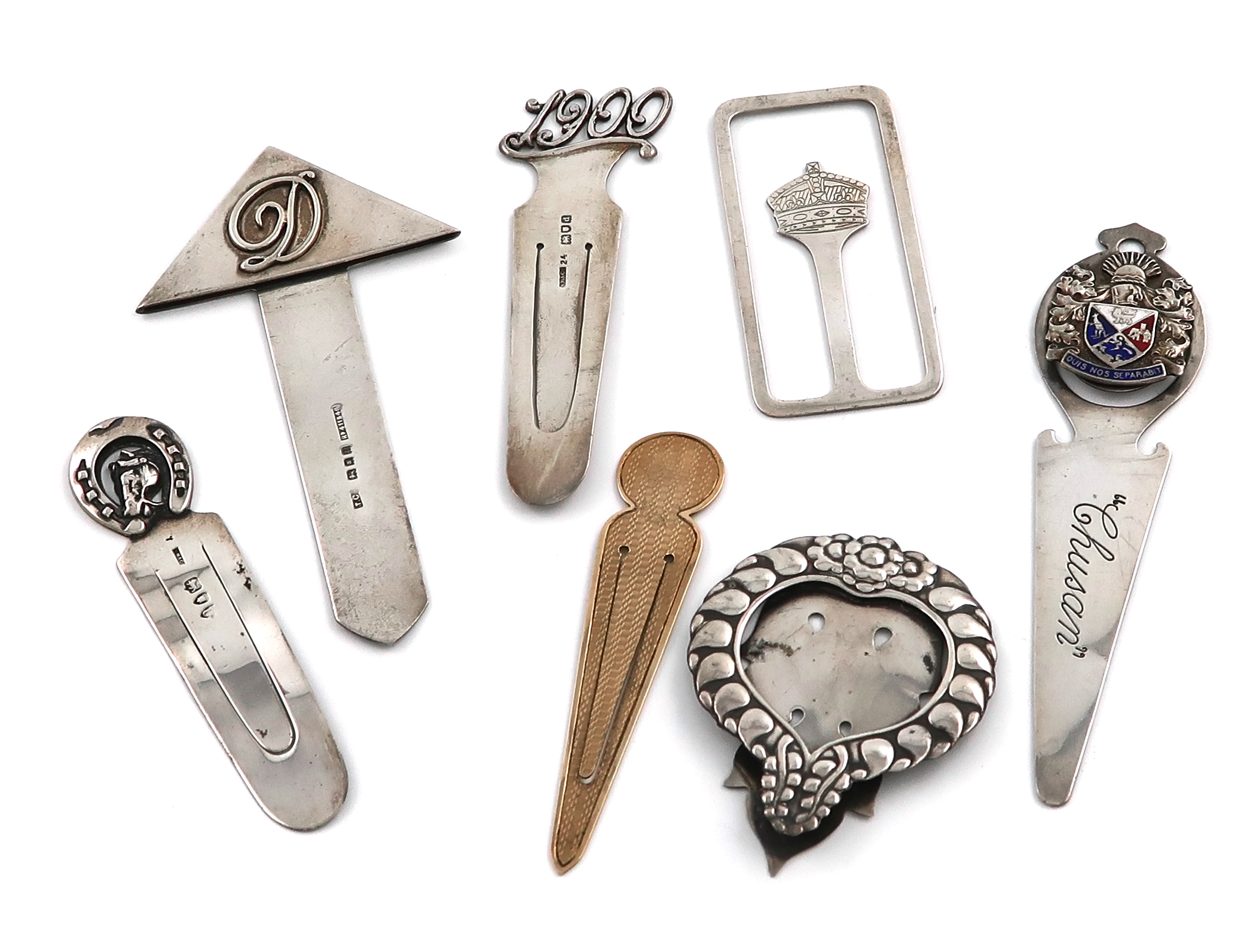 A small collection of seven silver and gold page markers