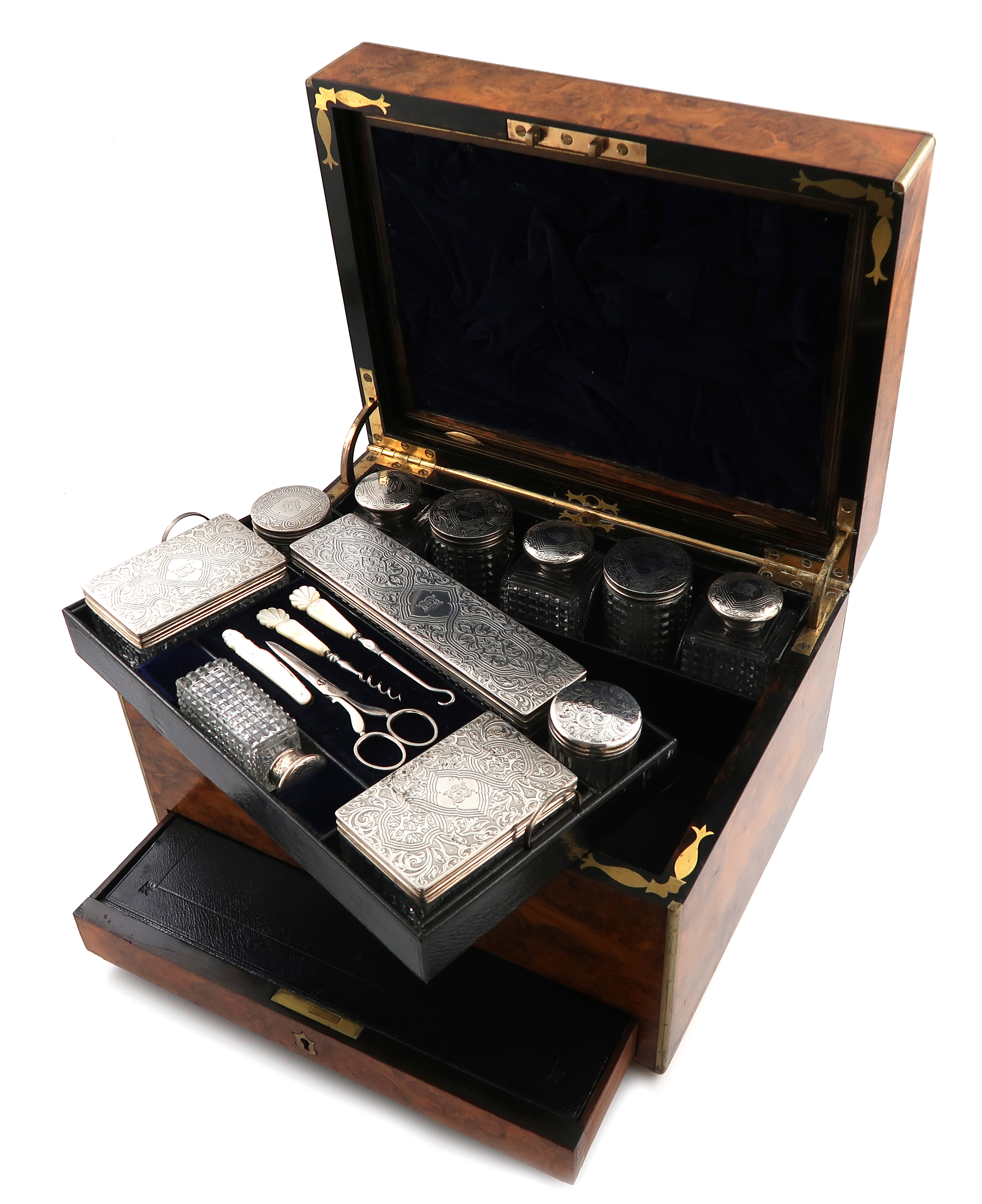 the covers with chased foliate scroll decoration, and with a monogram, hobnail cut-glass bodies, comprising: three scent bottles, a small scent bottle, three toilet boxes, three toilet jars, a replacement toilet jar and cover, also with a mother-of-pearl handled penknife, button hook and corkscrew and with a pair of scissors, in a fitted brass bound burr walnut case, the inside of the cover fitted with a mirror and stationary folder, the front with a pull-our drawer fitted for jewellery and with a writing slope, the cover with a monogram, length 32.3cm, height 20cm, approx. weighable 9.9oz.