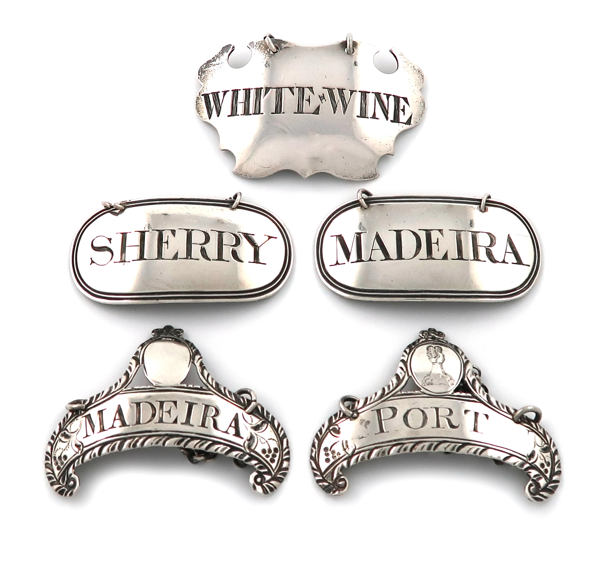 comprising: two George III examples by Hester Bateman, circa 1780, scroll form, gadroon borders, with pierced oval pediments, one crested, incised 'PORT' and 'MADEIRA', plus a pair of oblong form, reeded border, by Phipps and Robinson, London 1798/99, incised 'SHERRY' an 'MADEIRA', and one of cartouche form, by Richard Binley, incised 'WHITE WINE'. (5)