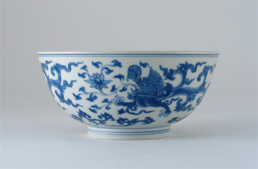 A Chinese blue and white bowl, painted with three dragons amidst flower and leaf scrolls, the interior with stylized Vajra, six character Chenghua mark but Kangxi 1662-1722, 16cm.