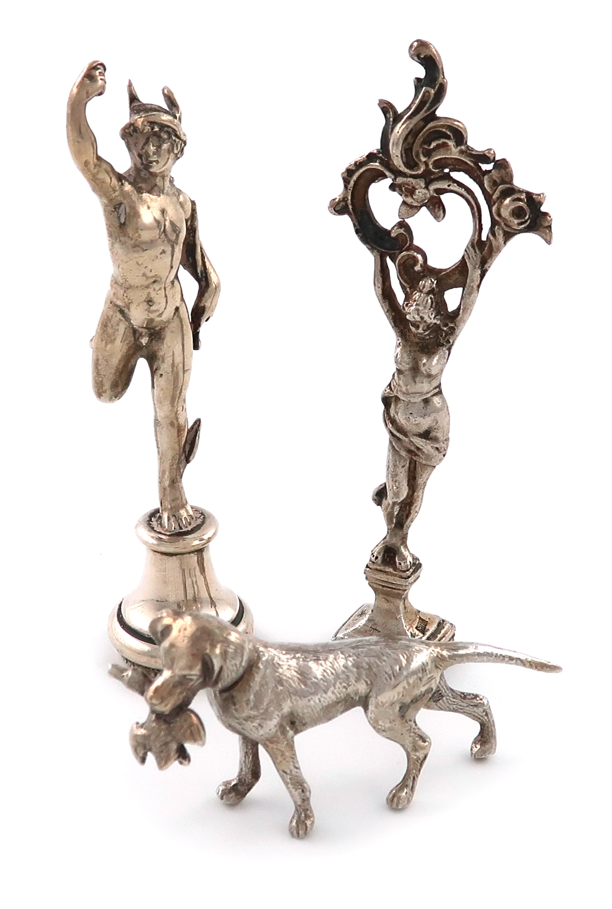 modelled in a standing position, length 5.5cm, plus a silver desk seal, with import marks for London 1903, importer's mark of by Berthold Muller, modelled as Mercury, plain matrix, plus another desk seal, with import marks for London 1924, modelled as a maiden, plain square matrix, approx. total weight 2.7oz. (3)