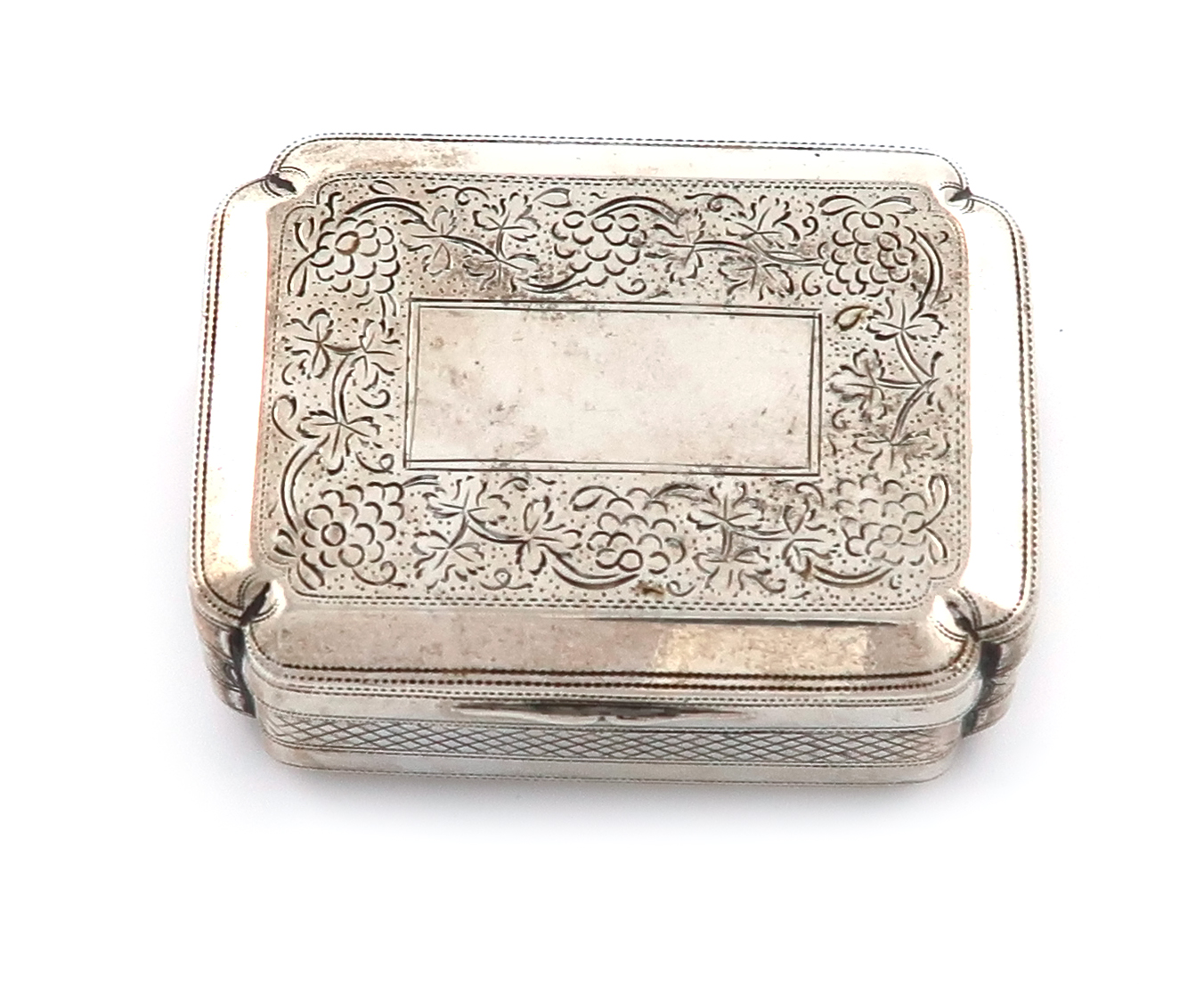 rectangular form, the cover and base with engraved grapevine decoration, the sides with trellis decoration, gilded interior, length 6cm, approx. weight 1.7oz.