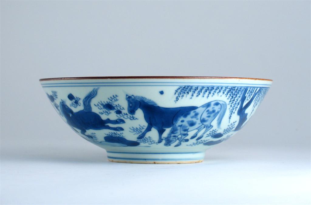 A Chinese blue and white bowl, painted with the eight horses of Mu Wang, beneath willow trees, the base with a four character mark, Kangxi 1662-1722, 21cm.