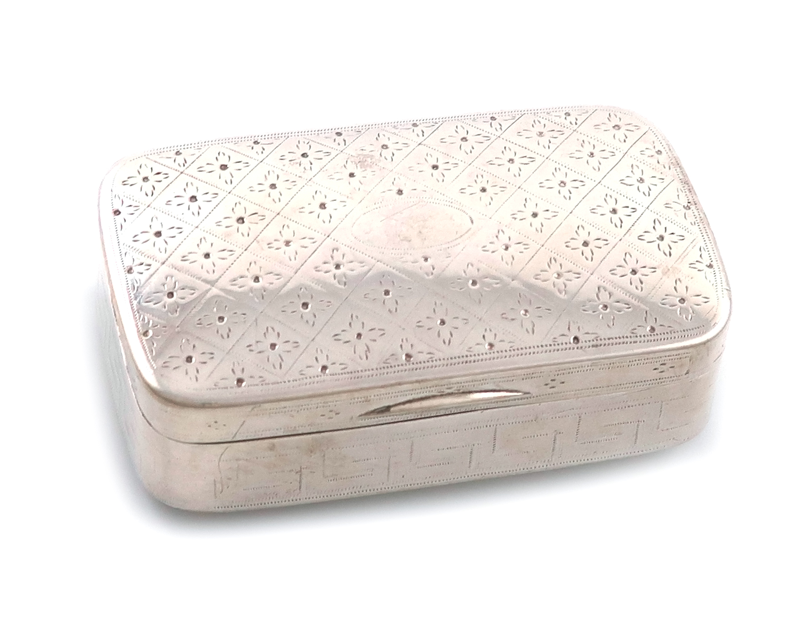 rectangular form, the cover and base with engraved decoration, plain thumb-piece, silver-gilt interior, length 6.3cm, approx. weight 1.8oz.