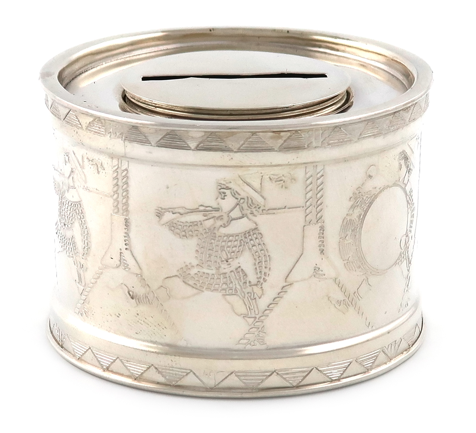 circular drum form, the side decorated with a marching band and soldiers, diameter 6.5cm, approx. weight 2.4oz.