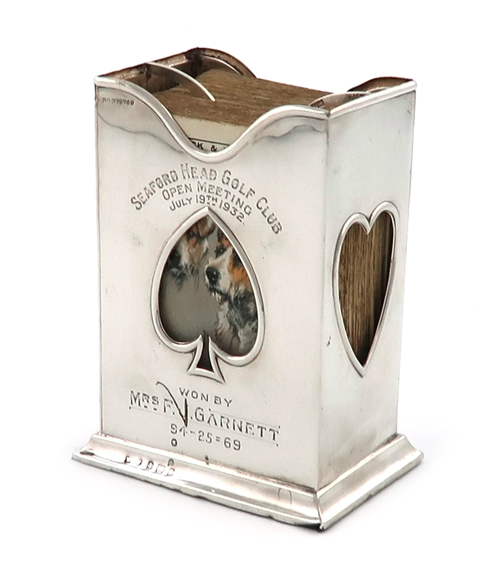 upright rectangular form, the sides pierced with the playing card suits, and with a presentation inscription, height 10.5cm.