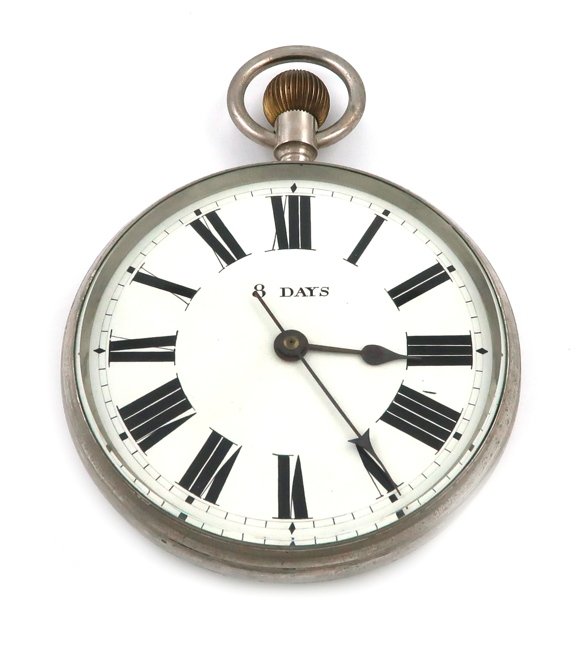 the face with Roman numeral and '8 Days', with a ring loop and winder, diameter 15cm.
