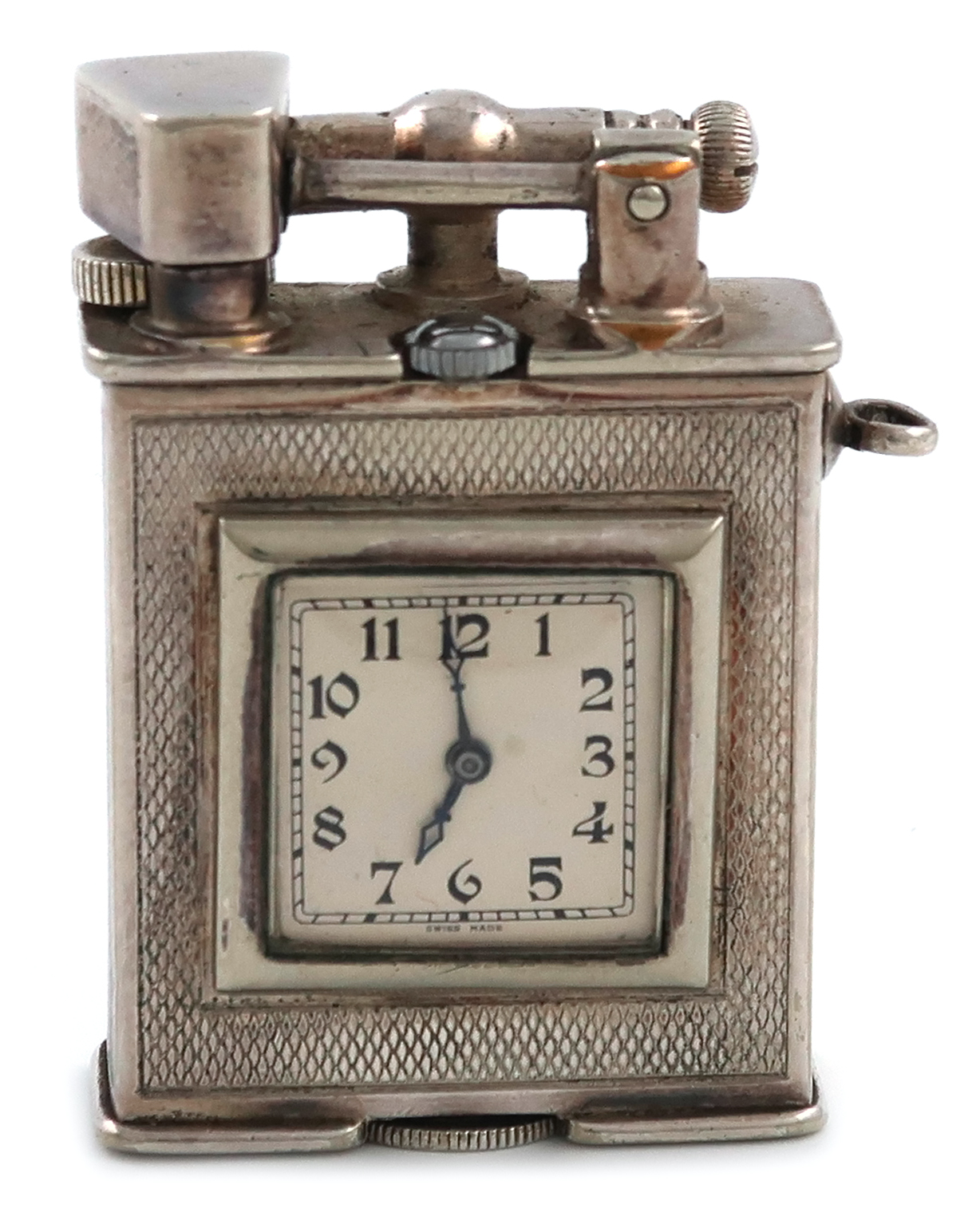 rectangular form, engine-turned decoration, the square dial, with 'Swiss made' in black, with a ring attachment, height 5.2cm.