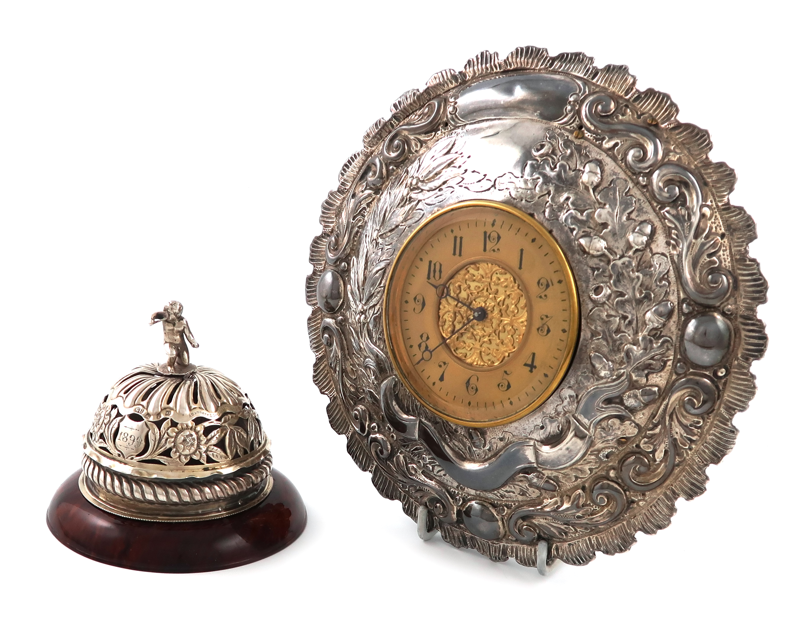 domed circular form, pierced and embossed foliate decoration, with a cherub finial, on a later tortoiseshell base, height 10cm, plus a Victorian silver cased wall clock, by Charles Edwards, London 1887, circular form, embossed scroll, foliate and acorn decoration, gilt face and case, velvet easel back, diameter 20.2cm. (2)