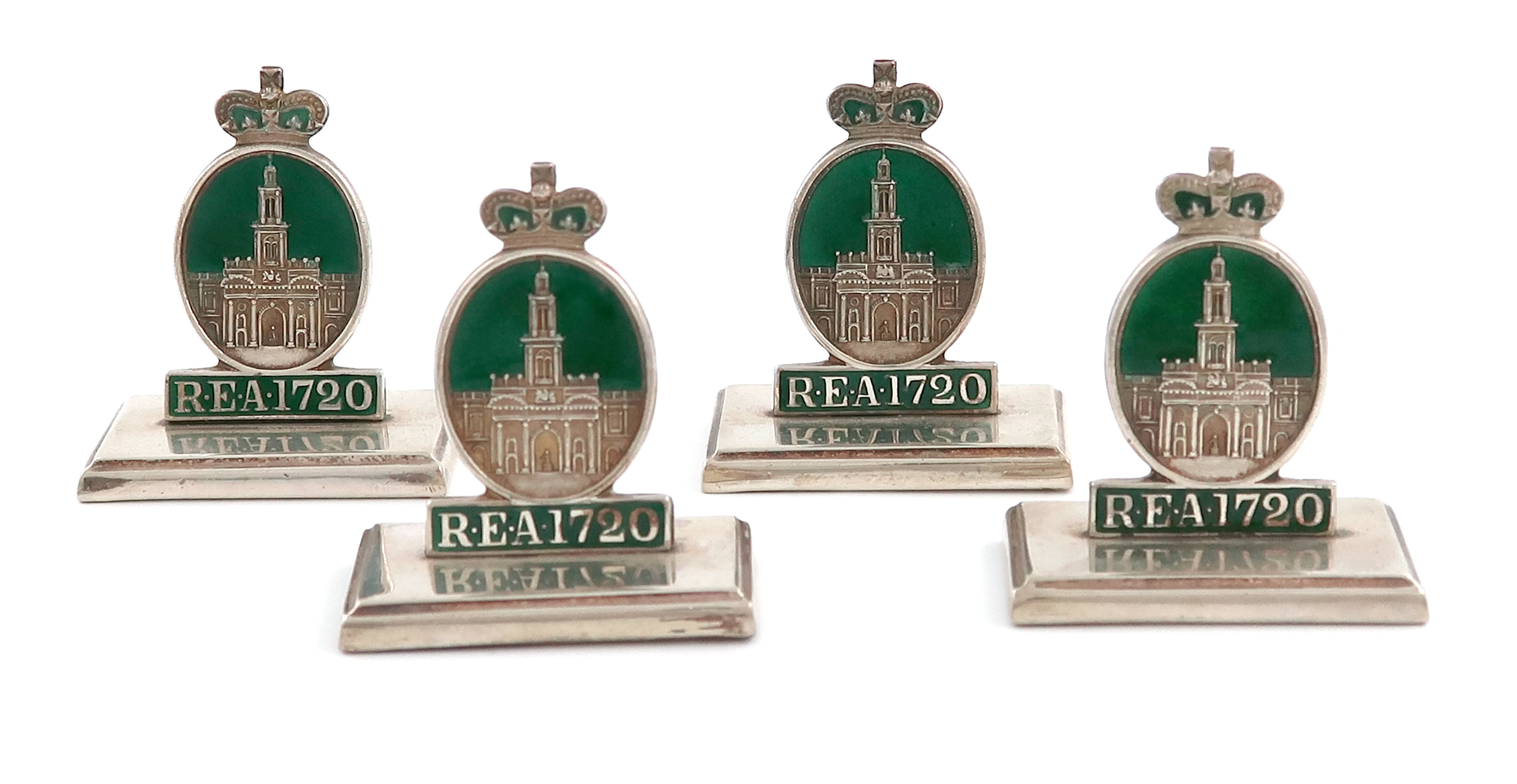 modelled as the badge of the Royal Exchanged Assurance Corporation, (founded in 1720), and depicting the Royal Exchange Building on a green enamel background, on a raised rectangular filled base, height 4.3cm. (4)