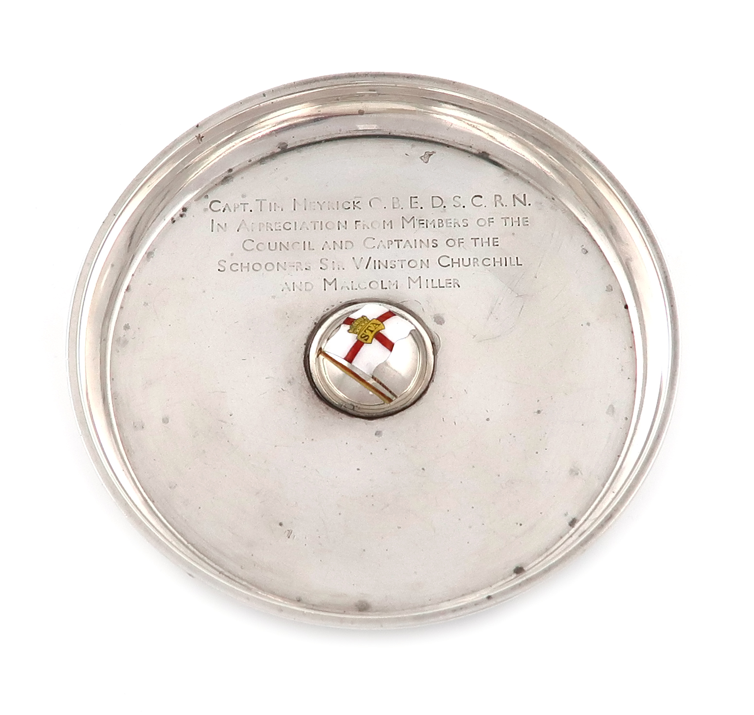 circular form, with a central raised button enamelled with the burgee of The Sail Training Association, and inscribed 'Capt. Tim Meyrick O.B.E, D.S C., R,N in Appreciation from Members of the Council and Captains of the Schooners Sir Winston Churchill and Malcom Miller', diameter 11.5cm, approx. weight 3oz.