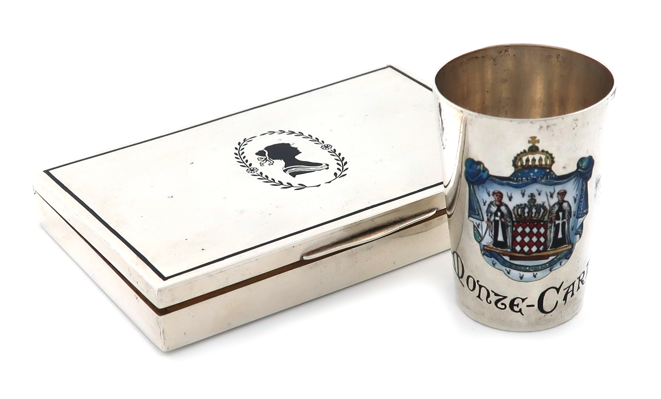 rectangular form, the hinged cover enamelled with a lady's head in a wreath surround, length 8.8cm, plus a German silver and enamel beaker, of tapering circular form, the front enamelled an armorial and 'Monte Carlo', approx. total weight 5oz. (2)