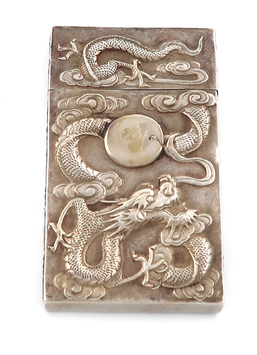 rectangular form, pull-off cover, the front embossed with a dragon, with a vacant cartouche, the reverse with bamboo and a bird, length 9cm, approx. weight 1.6oz.