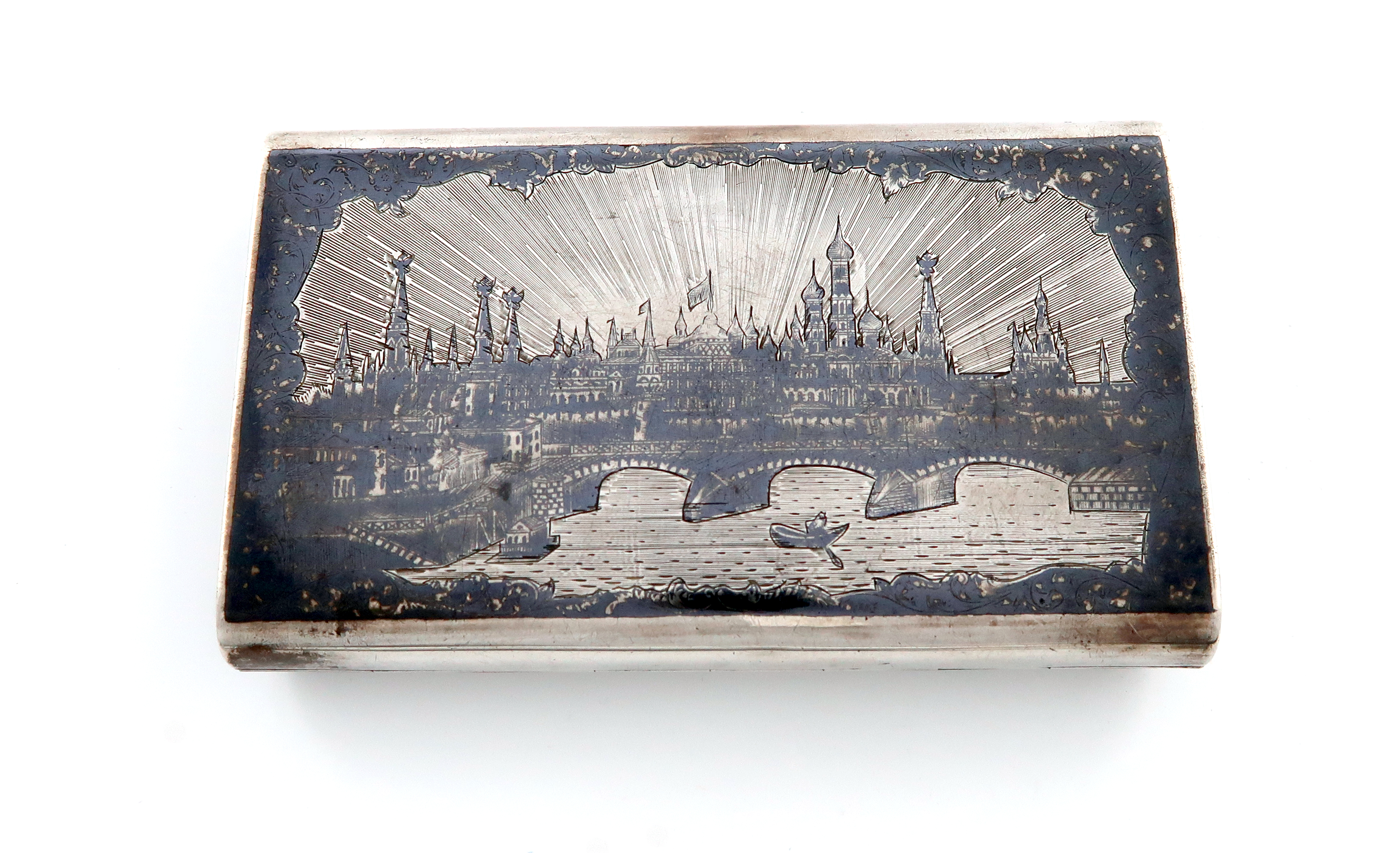 rounded rectangular purse form, with engine-turned and niello work foliate scroll decoration, the reverse with a niello scene of Moscow from the river, initialled, gilded interior, length 12.8cm, approx. weight 6oz.