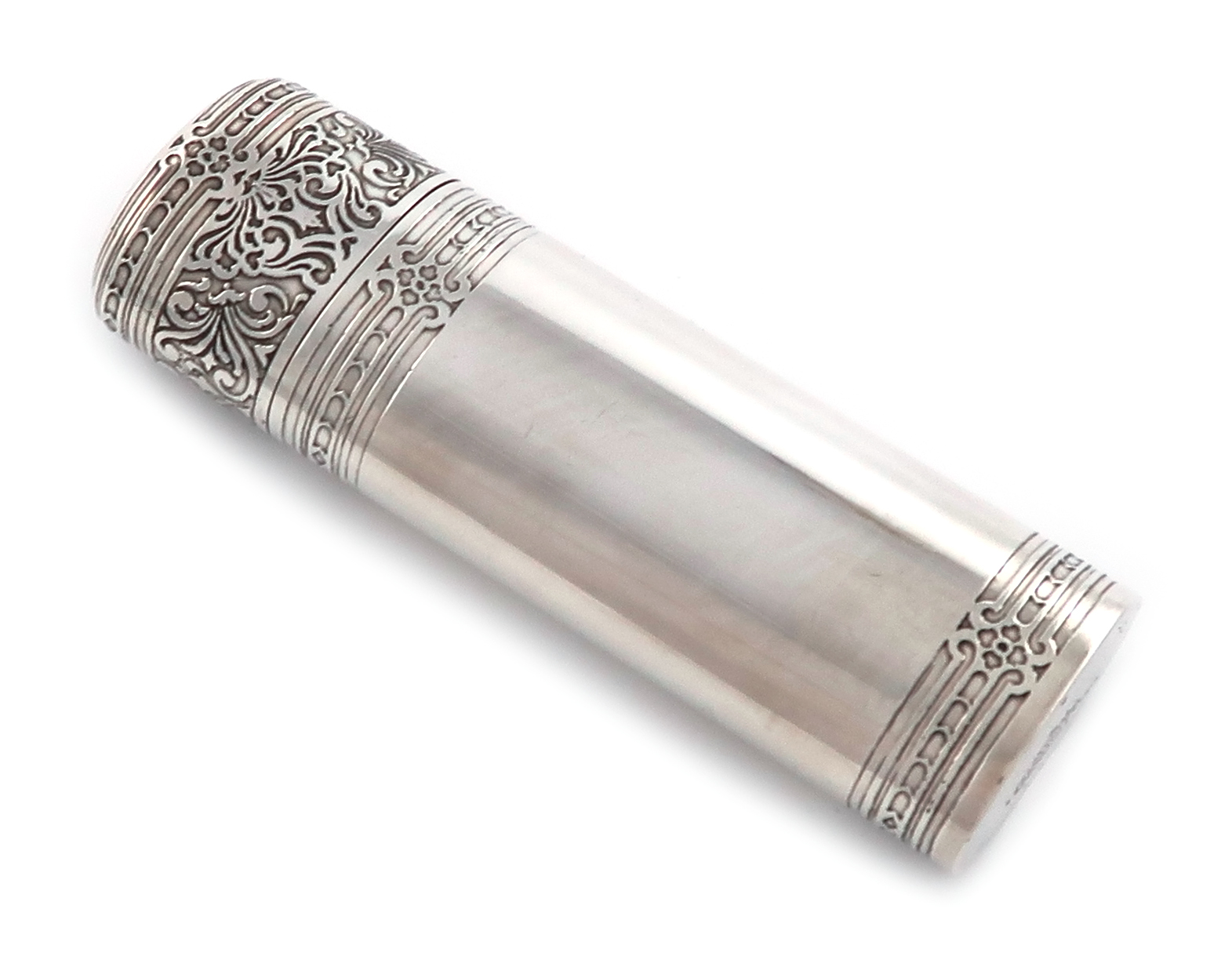 possibly for spectacles, oval cylindrical form, with chased foliate and stylised decoration, pull-off cover, length 12.2cm, approx. weight 3oz.