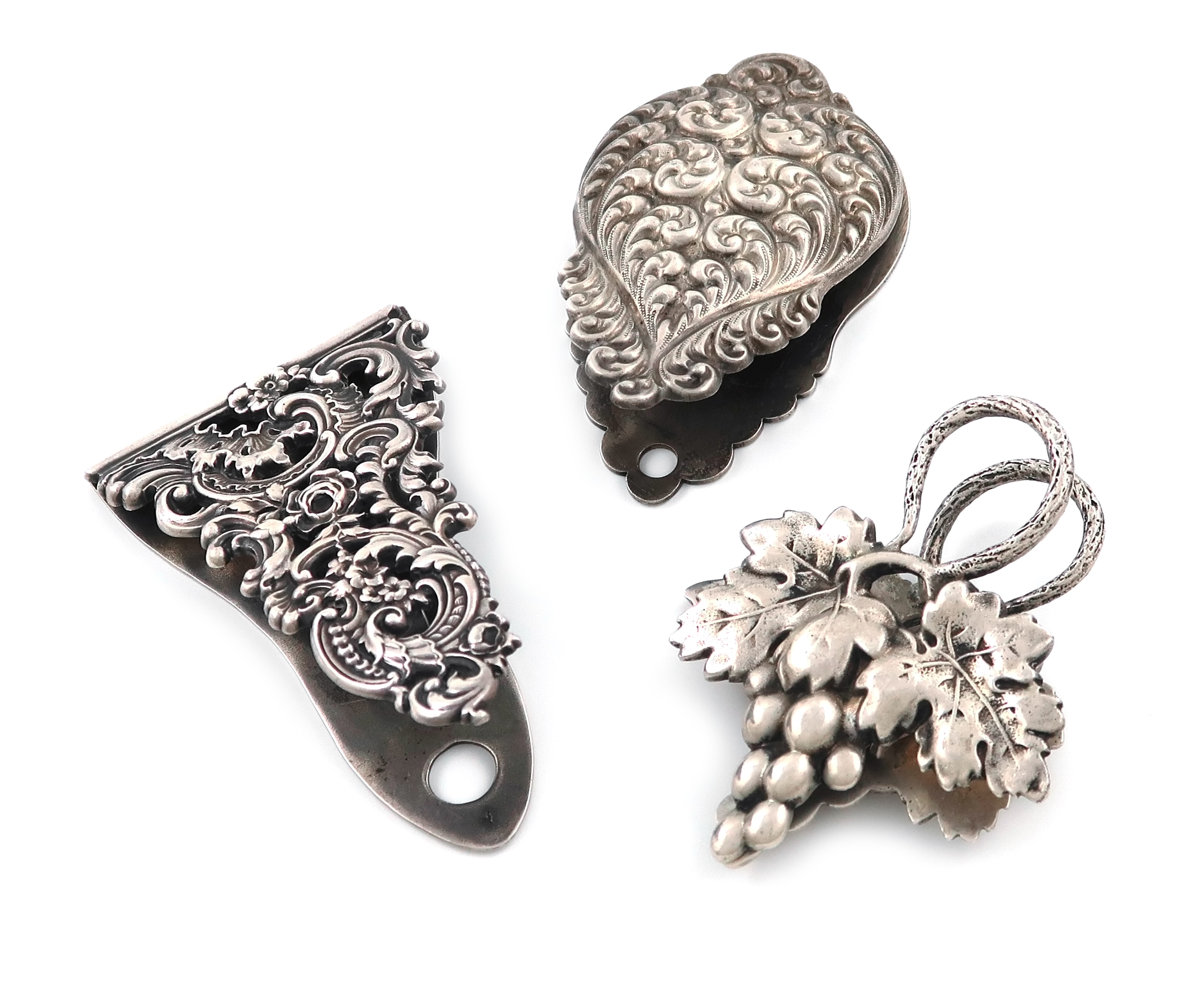 one with pierced foliate scroll decoration and one with embossed foliate decoration, plus an unmarked paper clip, formed as vine leaves and grapes with tendril ring handles, approx. weight 5.5oz. (3)