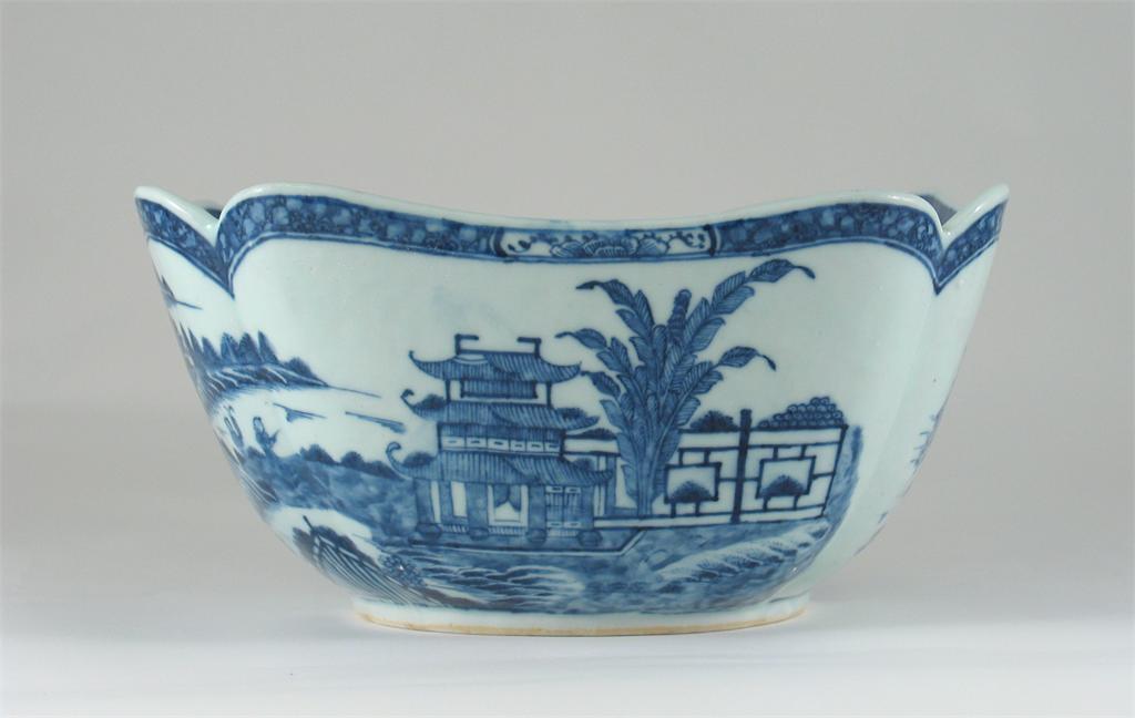A Chinese blue and white lobed square bowl, painted with figures, houses and boats in rocky landscapes, c.1780, 29.5cm.