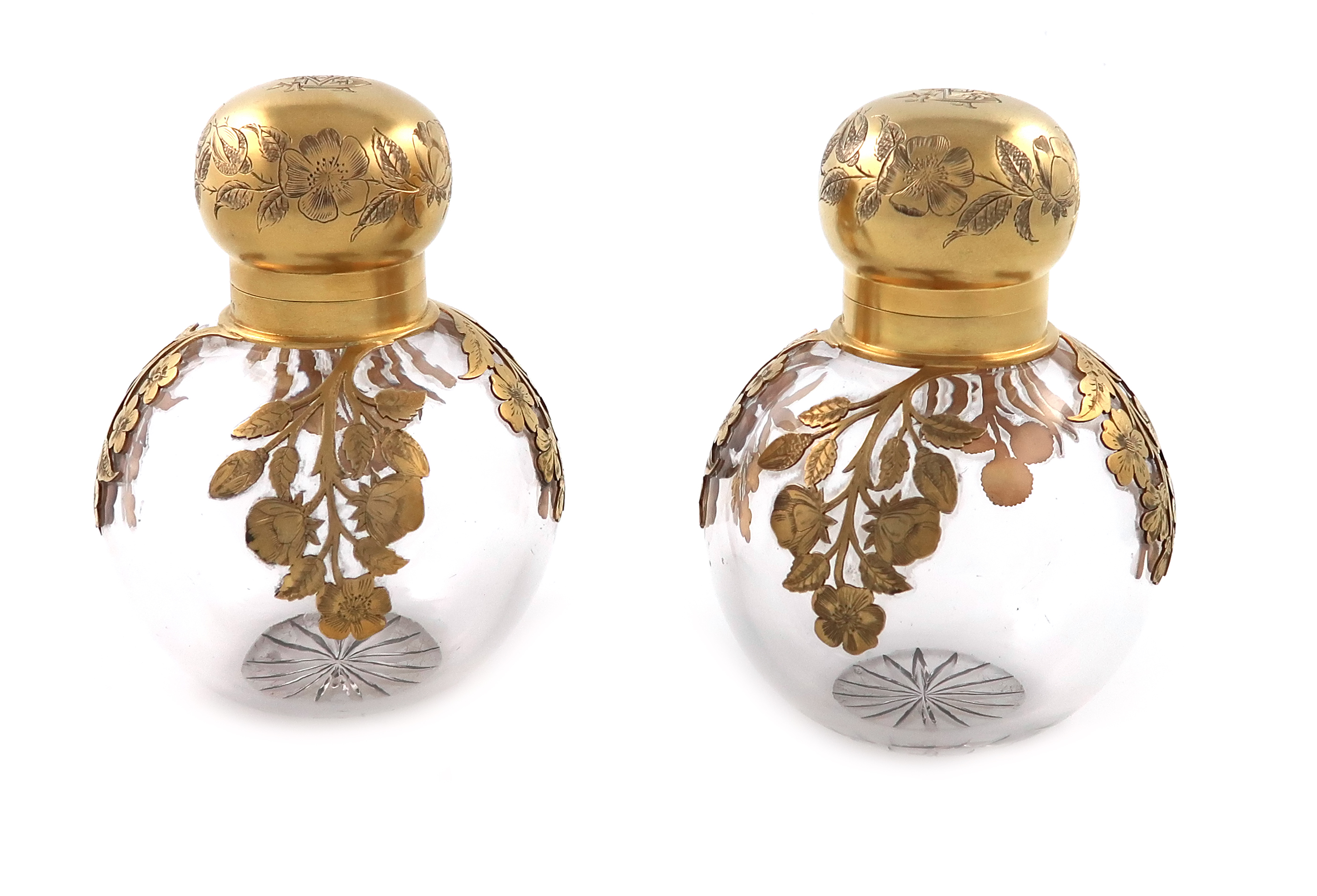 A pair of Victorian silver-gilt mounted glass scent bottles,