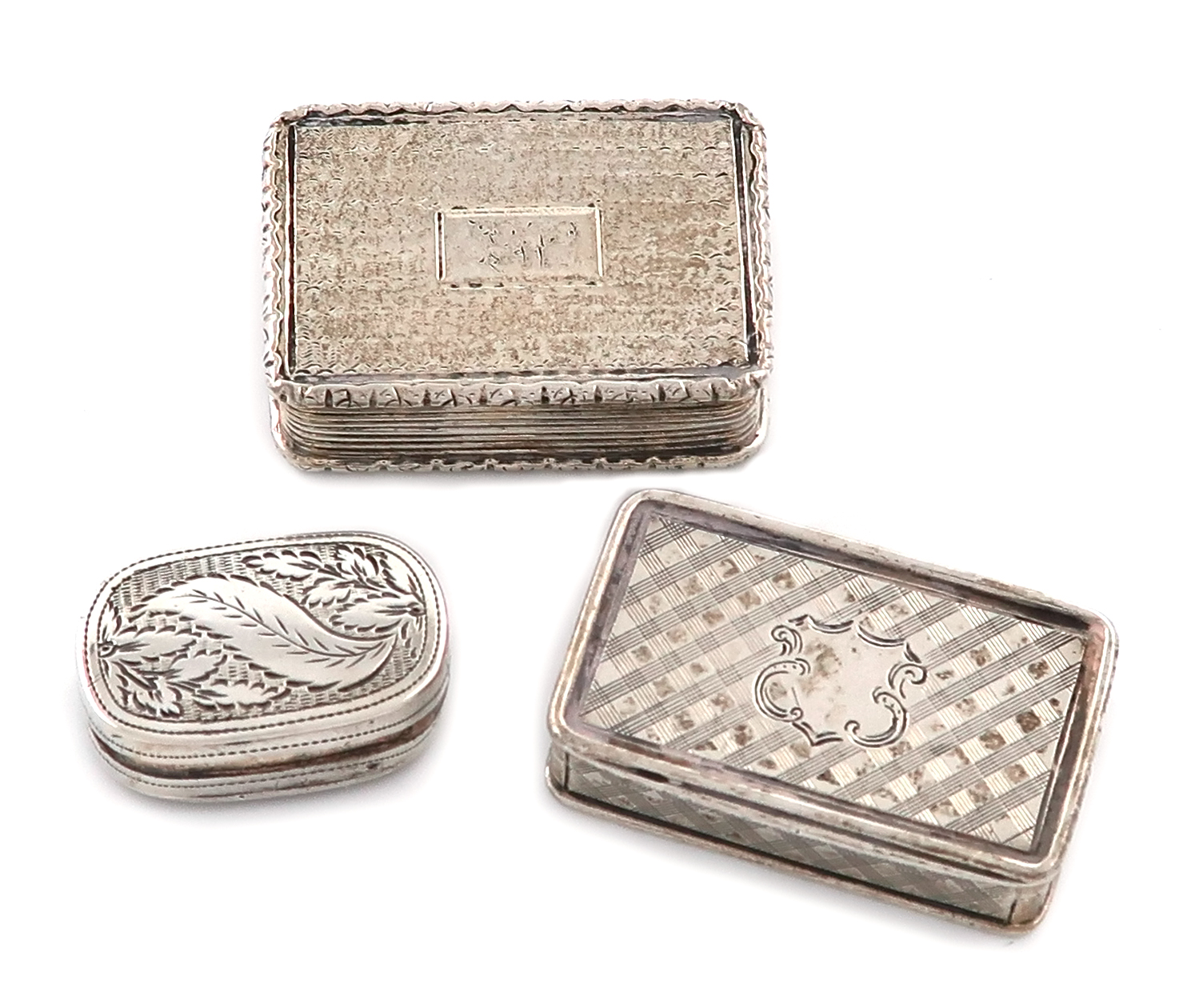 comprising: one by Nathaniel Mills, Birmingham 1841, rectangular form, engraved trellis decoration, the interior with a pierced and engraved foliate grille, length 3.4cm, one by Thomas Shaw, Birmingham 1827, rectangular form, engine-turned decoration, and an oblong one, by Joseph Willmore, Birmingham 1809, the grille a.f, approx. total weight 1.5oz. (3)