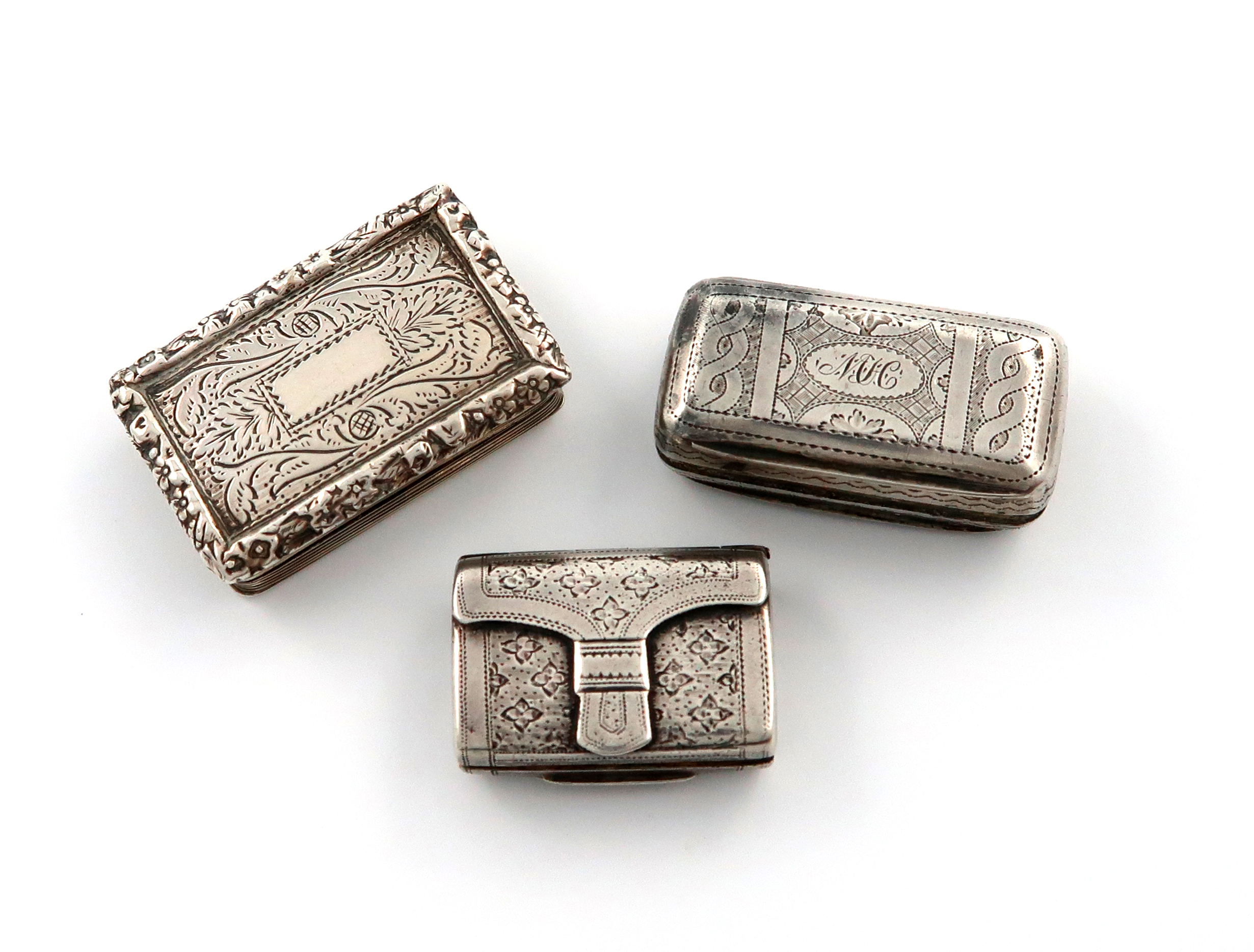 comprising: one by Joseph Willmore, Birmingham no date letter, purse form, engraved decoration, the interior with a pierced and engraved silver-gilt grille, length 2.5cm, plus a George III one by Simpson and Son, Birmingham 1812, rectangular form, engraved decoration, the cover initialled, and a Victorian one of rectangular form, Birmingham 1830, rectangular form, engraved decoration, approx. weight 1.1oz. (3)