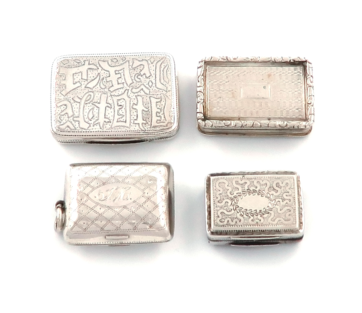 comprising: a George III vinaigrette, by Samuel Pemberton, Birmingham 1805, rectangular form, engraved with stylised lettering, the underside with Greek key decoration and a vacant cartouche, the interior with a silver-gilt filigree grille, plus a William IV vinaigrette, by Nathaniel Mills, London 1836, rectangular form, engine-turned decoration, another by Samuel Pemberton, Birmingham 1802, engraved decoration with a filigree grille, and one other lacking grille, approx. total weight 2oz. (4)