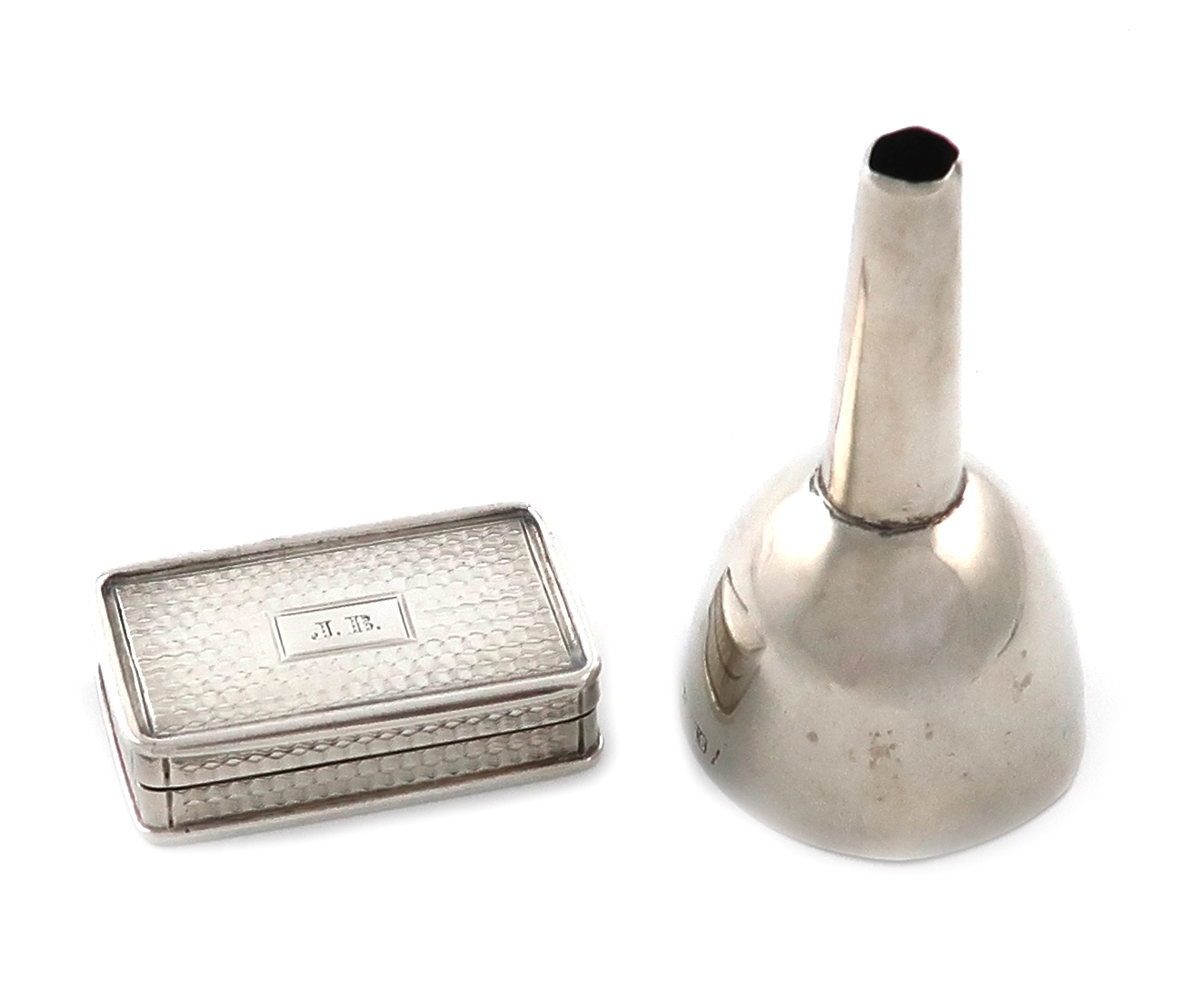 rectangular form, engine-turned decoration, the interior with a pierced and engraved silver-gilt grille, the cover initialled, length 3.3cm, and a silver scent funnel, by S. Mordan and Co., London 1890, approx. total weight 0.7oz. (2)