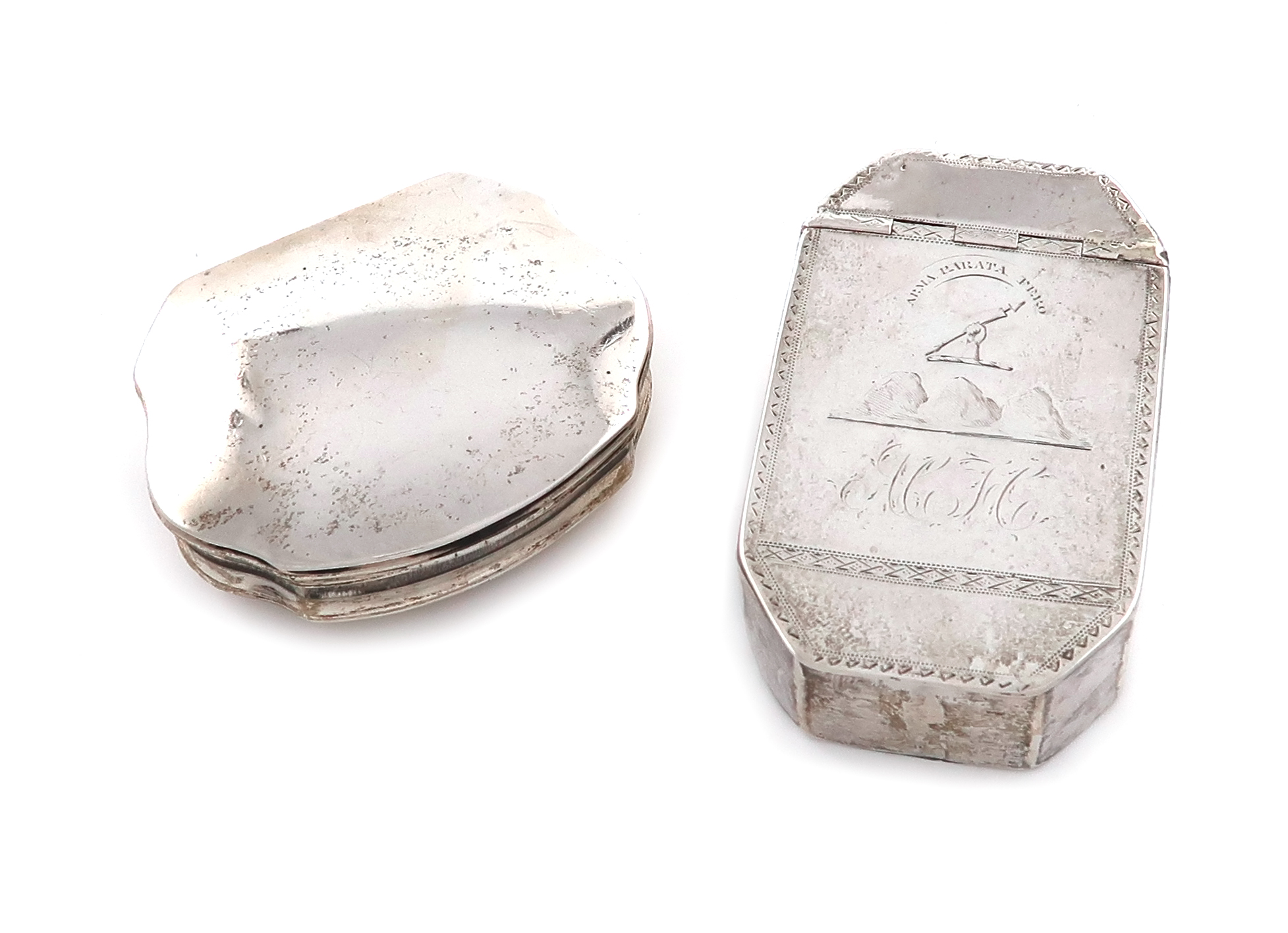 cartouche form, the interior gilded, length 6.8cm, plus another George III Scottish snuff box, marked with town mark, duty mark and maker's mark, possibly I.M, rectangular form, bright-cut decoration, the hinged cover with a crest and initials, length 7.8cm, approx. weight 4.4oz. (2)