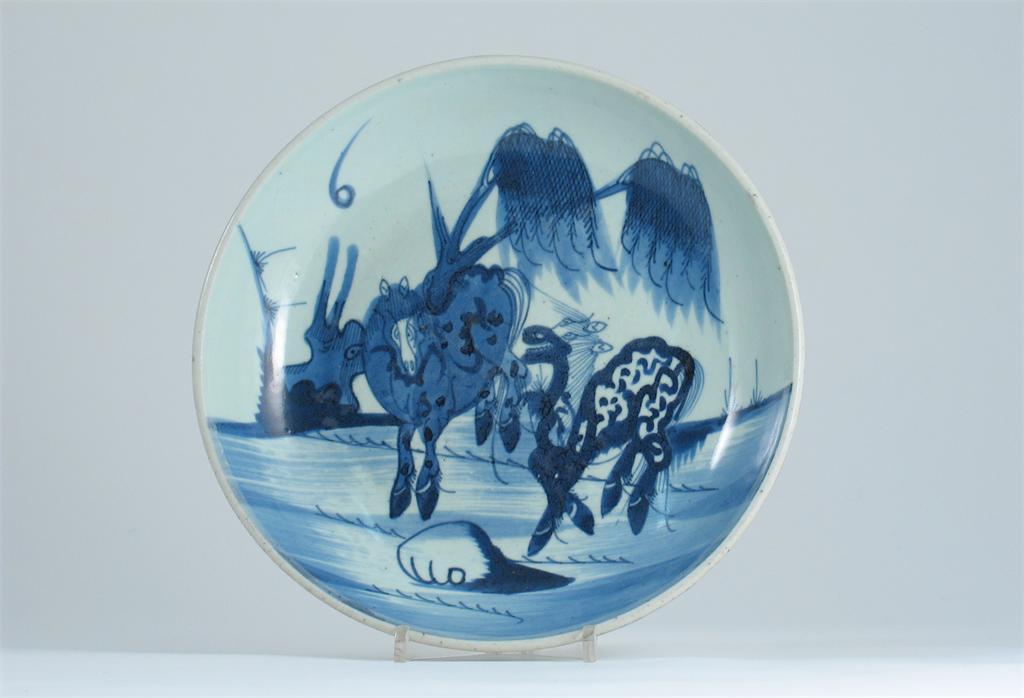 A Chinese blue and white dish, painted with two horses beneath a willow tree, c.1820, 25.5cm.