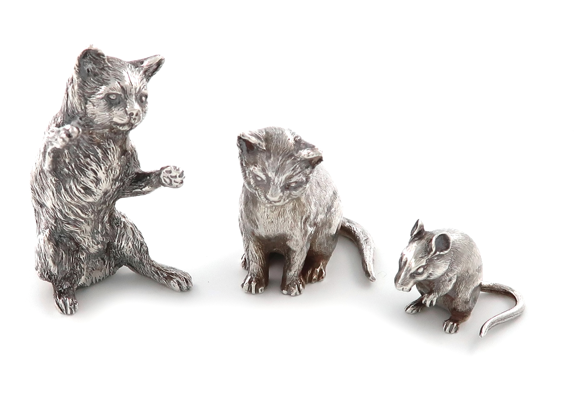 with textured fur decoration, plus another cat, by B S E Products, London 1991, modelled in a seated position, height of cat 7cm, approx. total weight 7.2oz. (3)