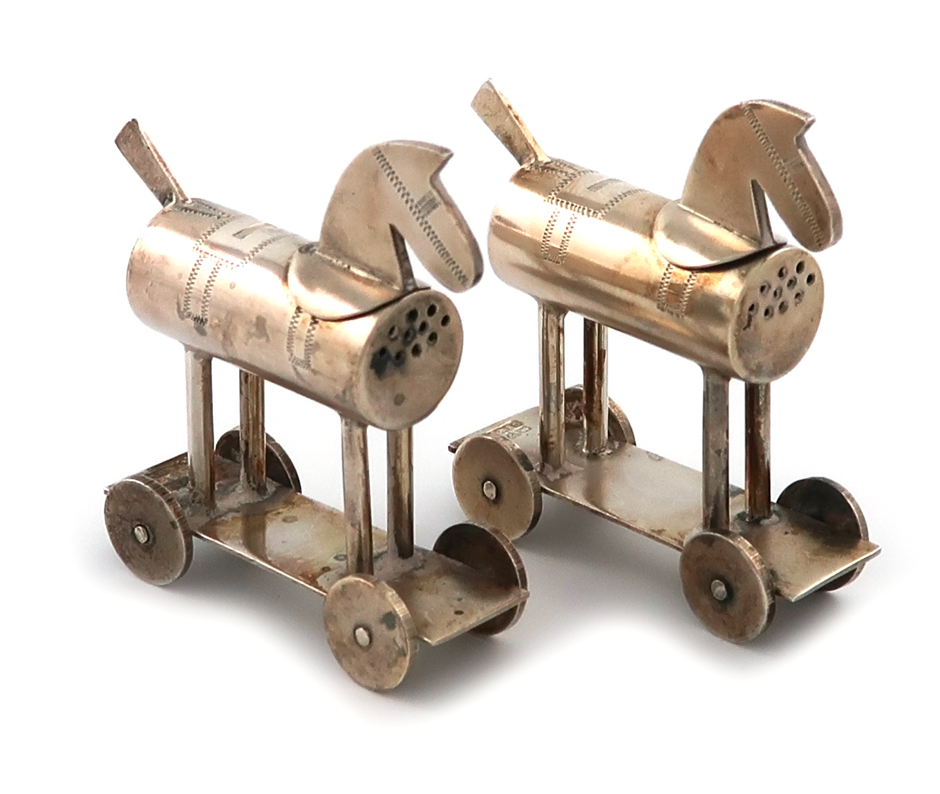 modelled as hobby horses, pull-off heads, on rectangular bases on four wheels, length 4.4cm, approx. weight 1.4oz. (2)