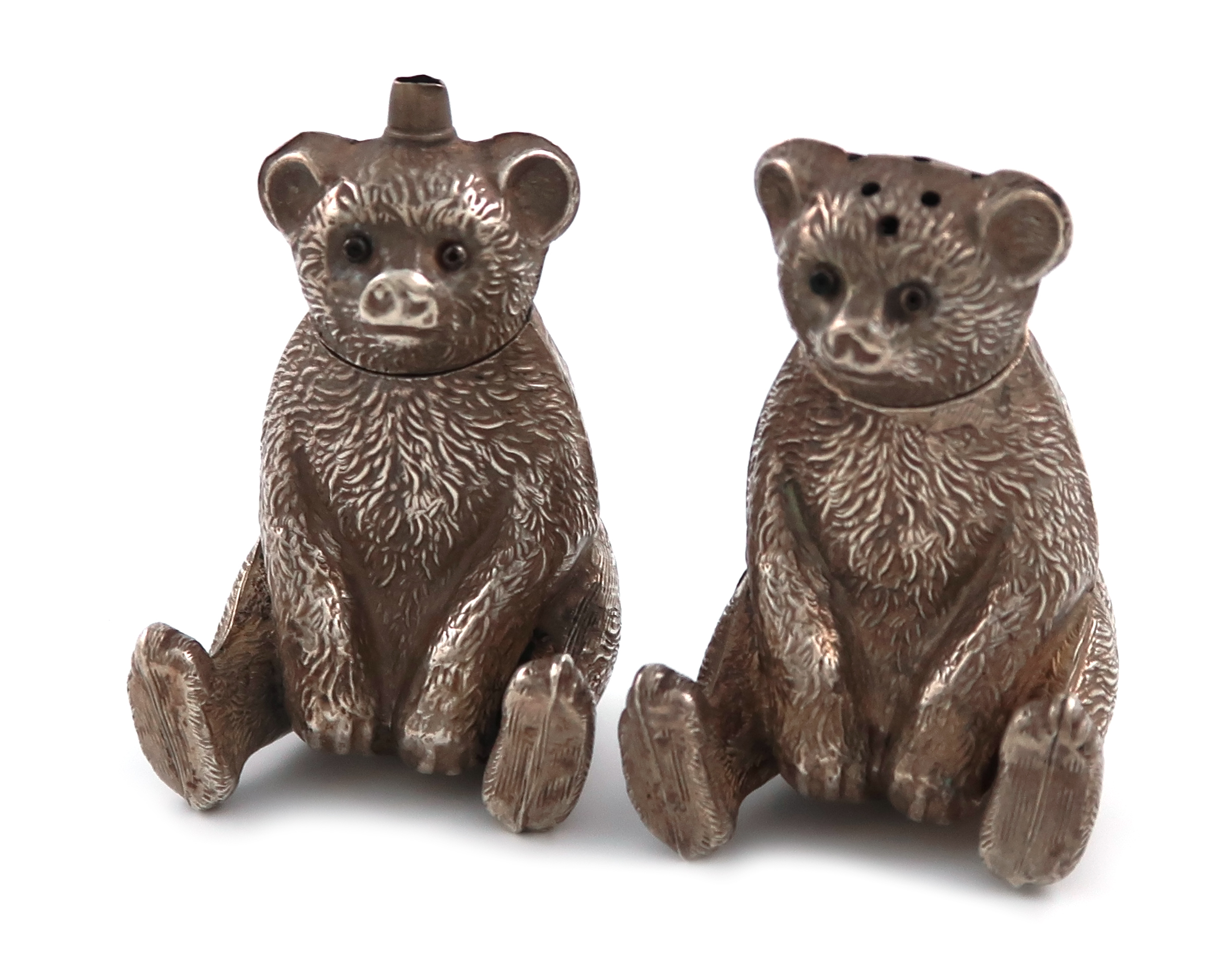modelled in seated positions, the pull-off heads with silver eyes, textured fur, height 5.3cm, approx. weight 0.9oz. (2)