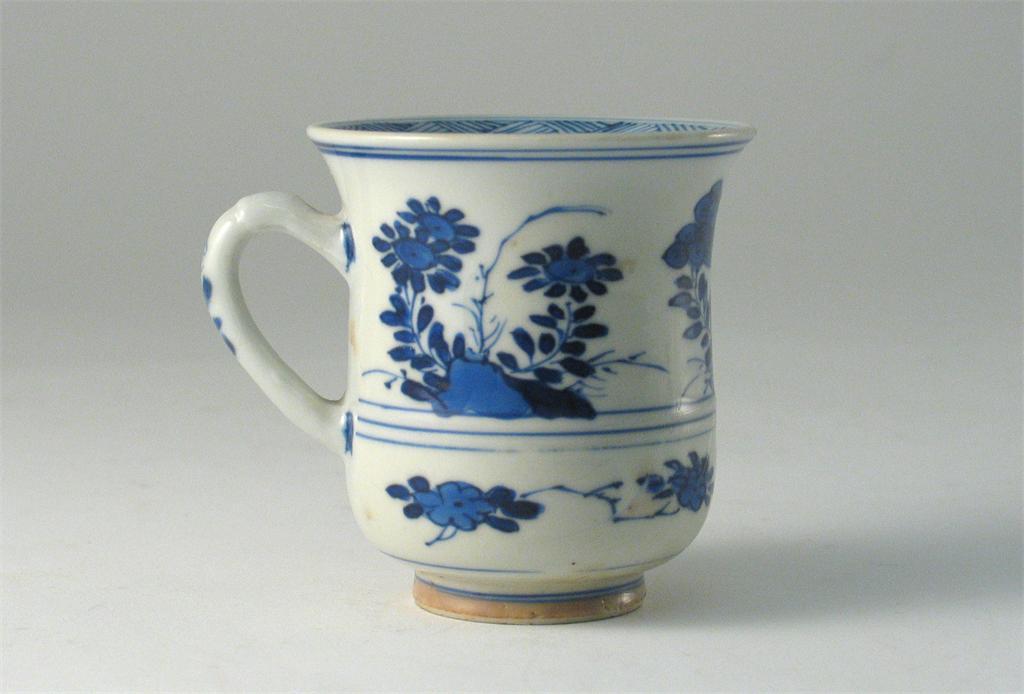 A Chinese blue and white mug, painted with flowers. A little glaze staining. Kangxi 1662-1722, 7cm.