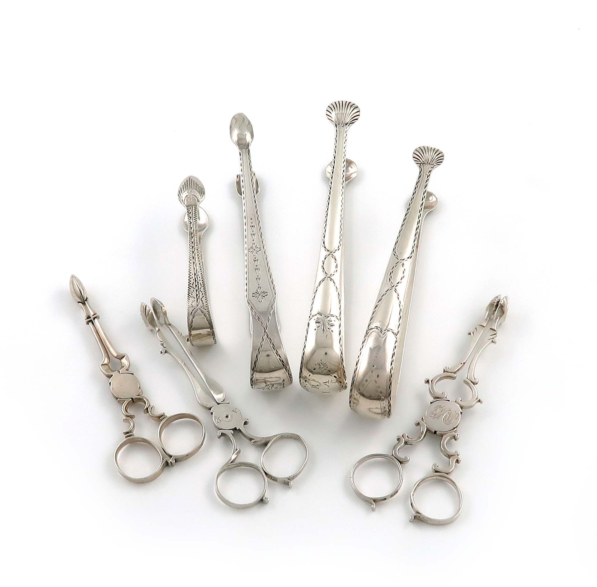 including an Irish provincial pair, by John Nicolson, Cork, circa 1790, the terminal with a crest, two pairs of Dublin Bright-cut tongs, a small London pair, and three pairs of 18th century London sugar nips, scissor form, ring handles, approx. total weight 7.4oz. (7)