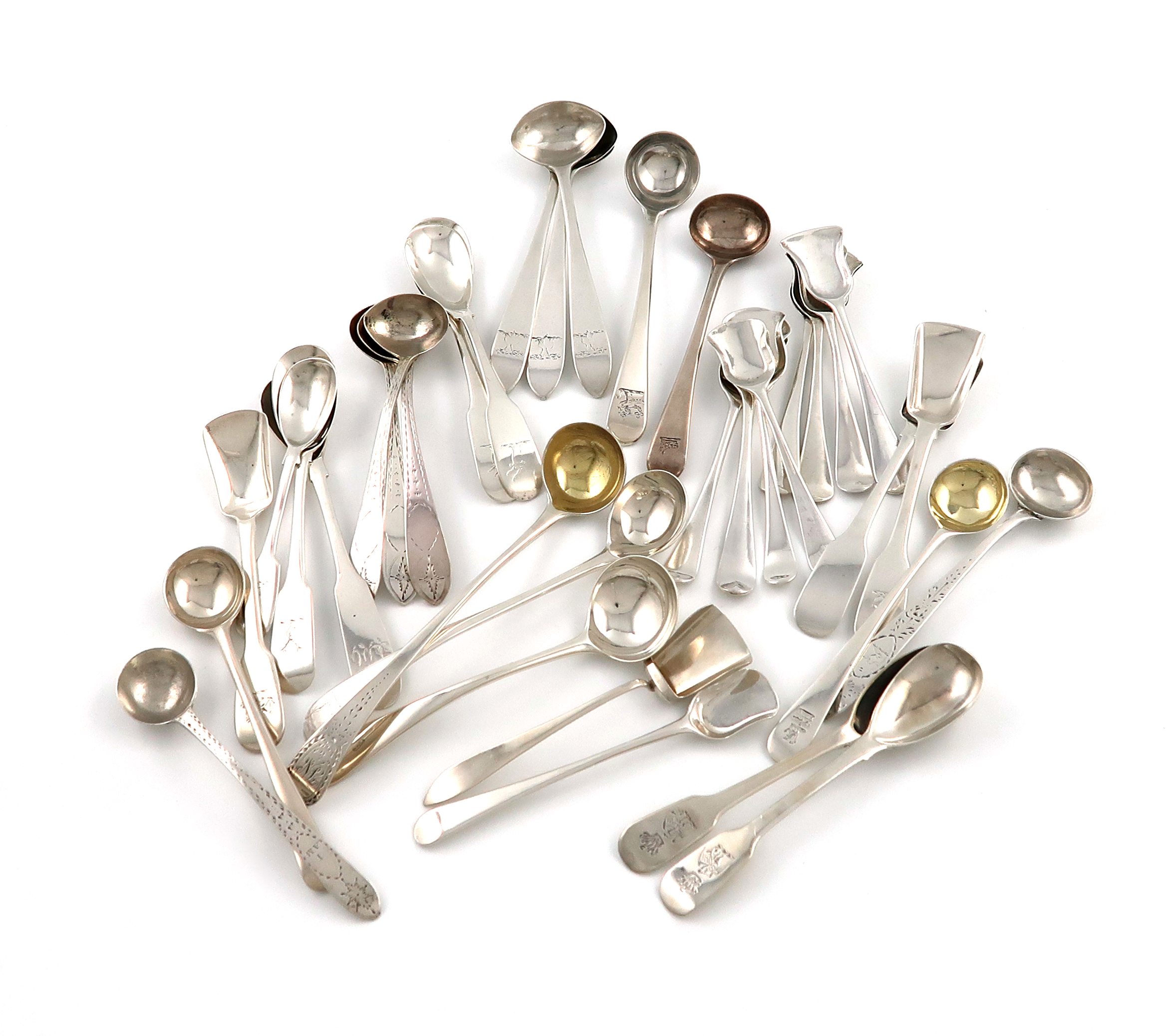 including: a set of three Irish Bright-cut salt spoons, by John Pittar, Dublin circa 1790, another set of three Celtic point salt spoons, and two Bright -cut salt spoons, six Irish egg / mustard spoons, a mustard spoon, by William Reynolds, Cork, circa 1795, plus seven various London condiment spoons, three Irish salt shovels, nine London salt shovels, and a Danish condiment spoon, approx. weight 10oz. (qty)