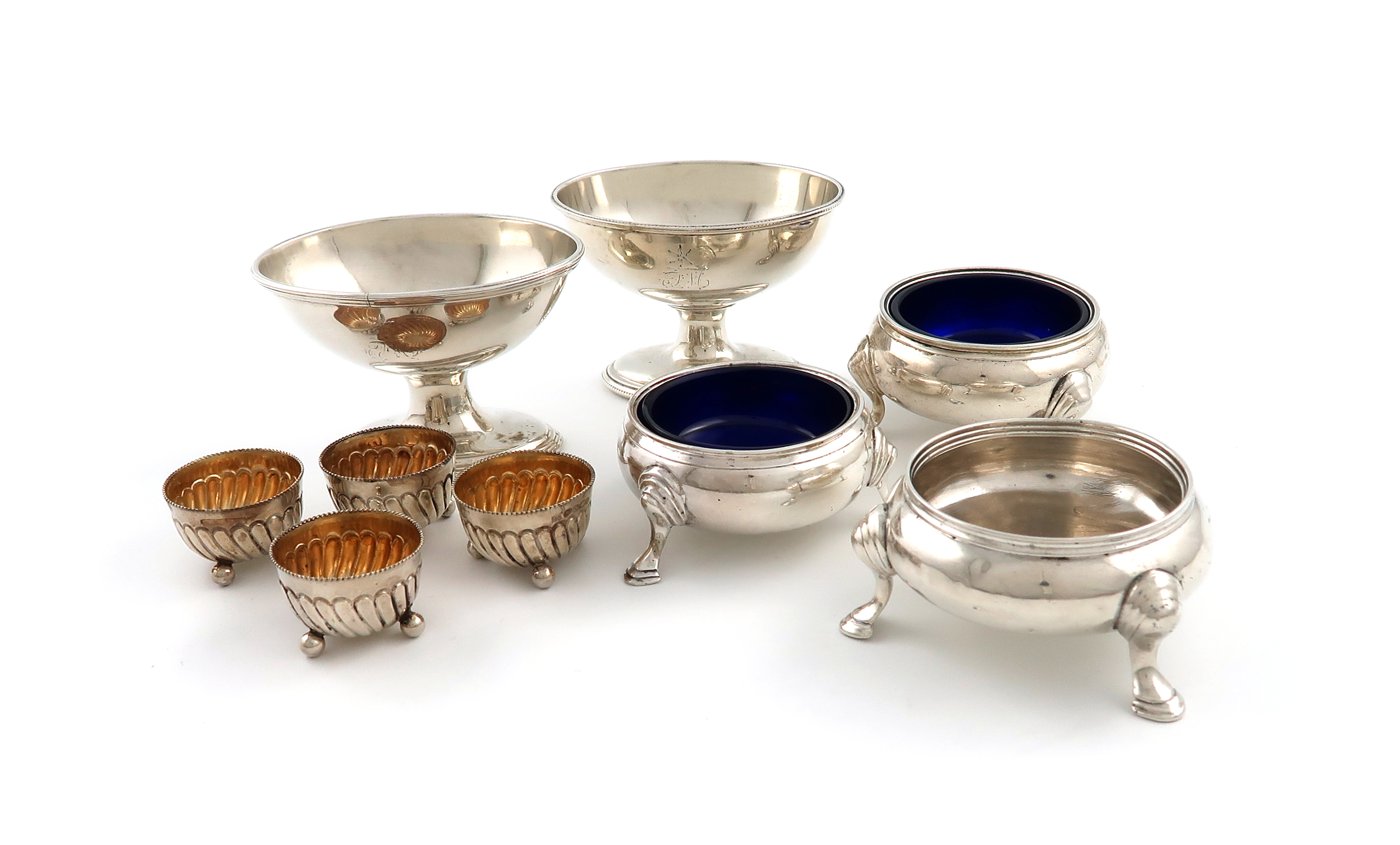 oval form, beaded border, engraved with a crest, on raised oval bases, beaded borders, length 8.8cm, plus an 18th century cauldron salt cellar, by William Williamson, Dublin circa 1740, and a set of four small Victorian silver-gilt salt cellars, by E. Johnson, Dublin 1883, fluted circular form, and two London cauldron salt cellars, approx. weight 13.5oz. (9)