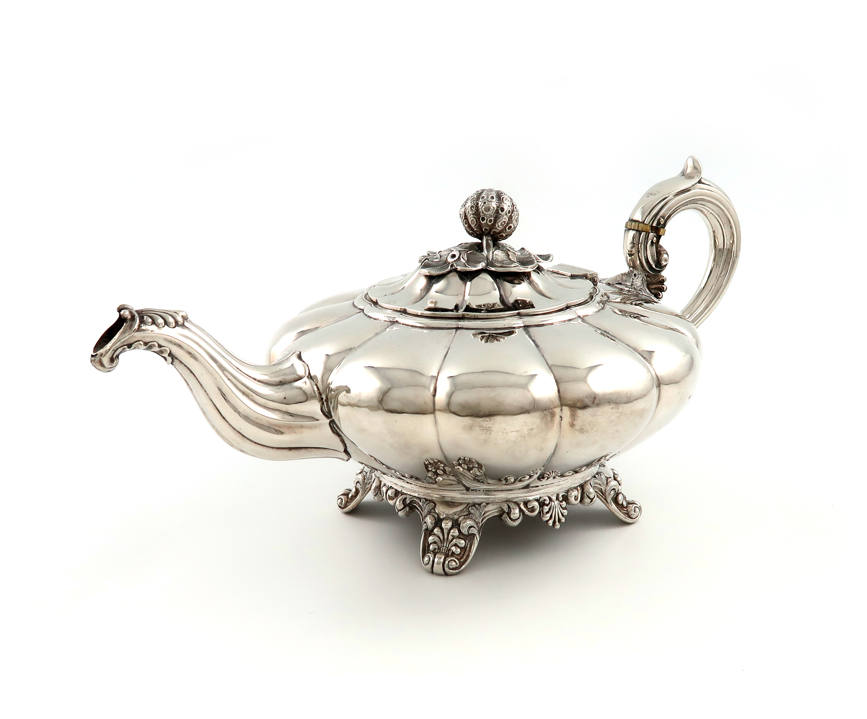 lobed circular form, scroll handle with ivory insulators, the hinged cover with a melon finial, on four foliate scroll bracket feet, length handle to spout 31cm, approx. weight 25.3oz.