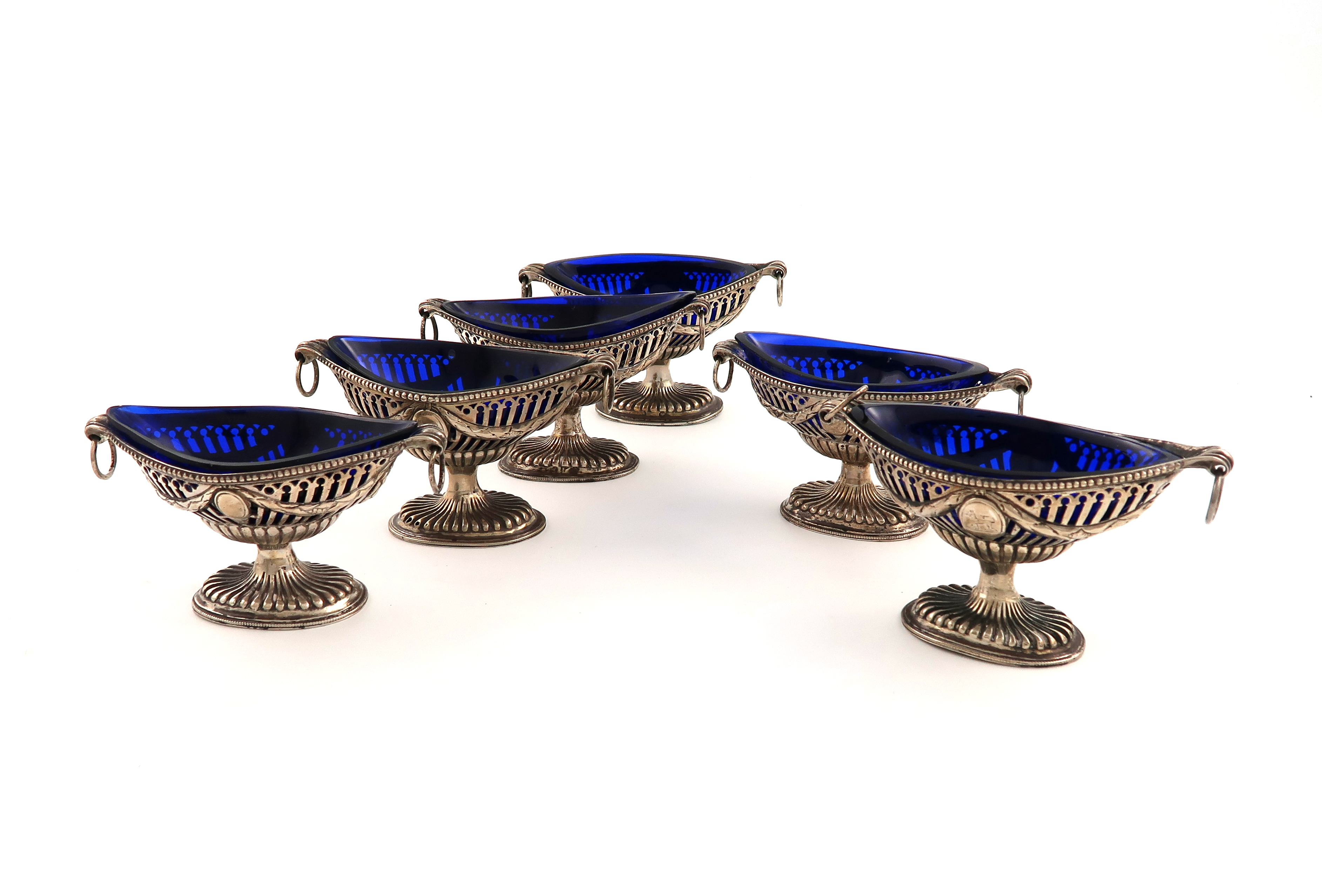 oval navette form, pierced with slats and embossed with swags, drop ring handles, on raised fluted oval bases, with blue glass liners, length 13cm, approx. weight 19oz. (6)