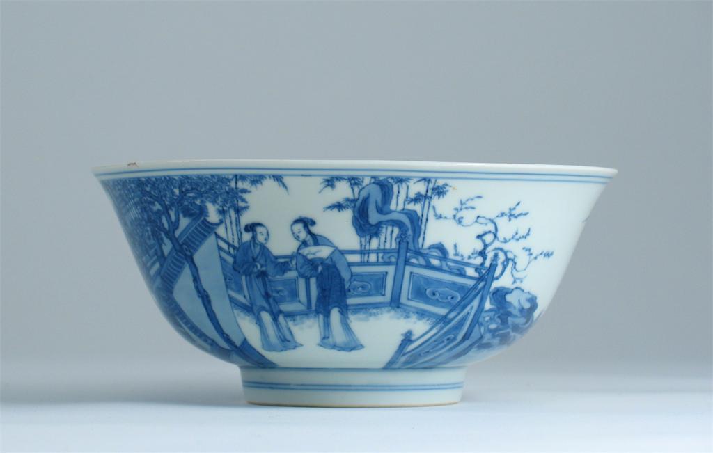 A Chinese blue and white flared bowl, well painted with two maidens and a seated figure in a landscape, the interior with the 'Three Friends' around rockwork. Rim chips and a short crack. The base with a six character Chenghua mark but Kangxi 1662-1722, 17cm. Together with a wood stand. (2)