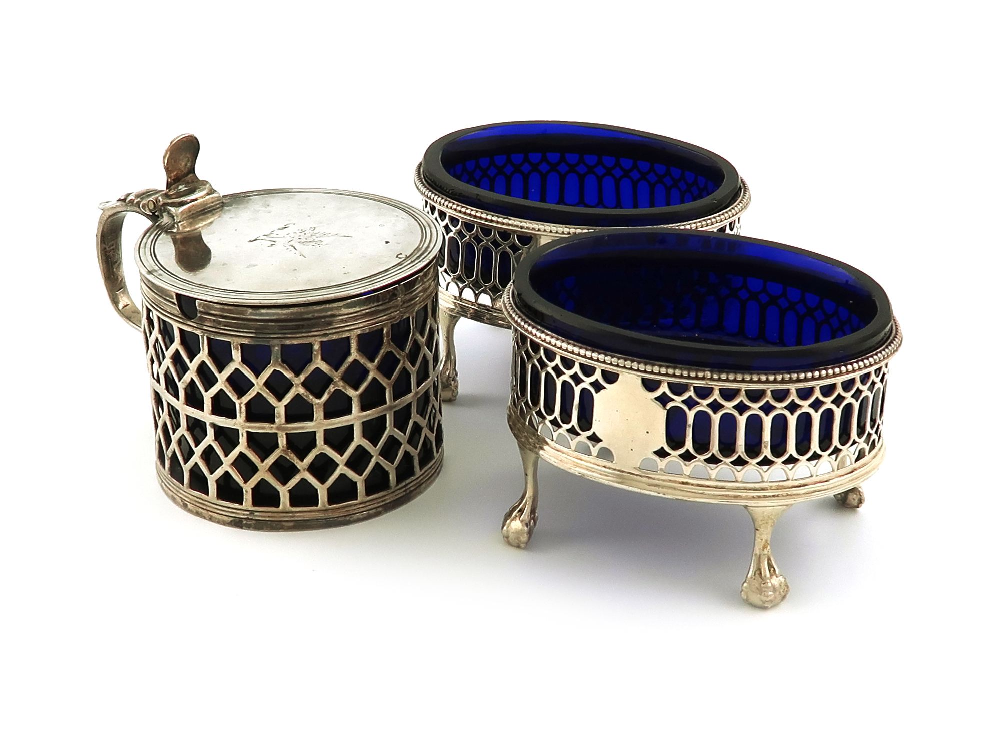 circular from, pierced body, the hinged cover with a crest, scroll handle, plus a pair of George III salt cellars, by Robert Hennell, London 1775, oval pierced form, with blue glass liners, on four claw and ball feet, approx. total weight 7.5oz. (3)