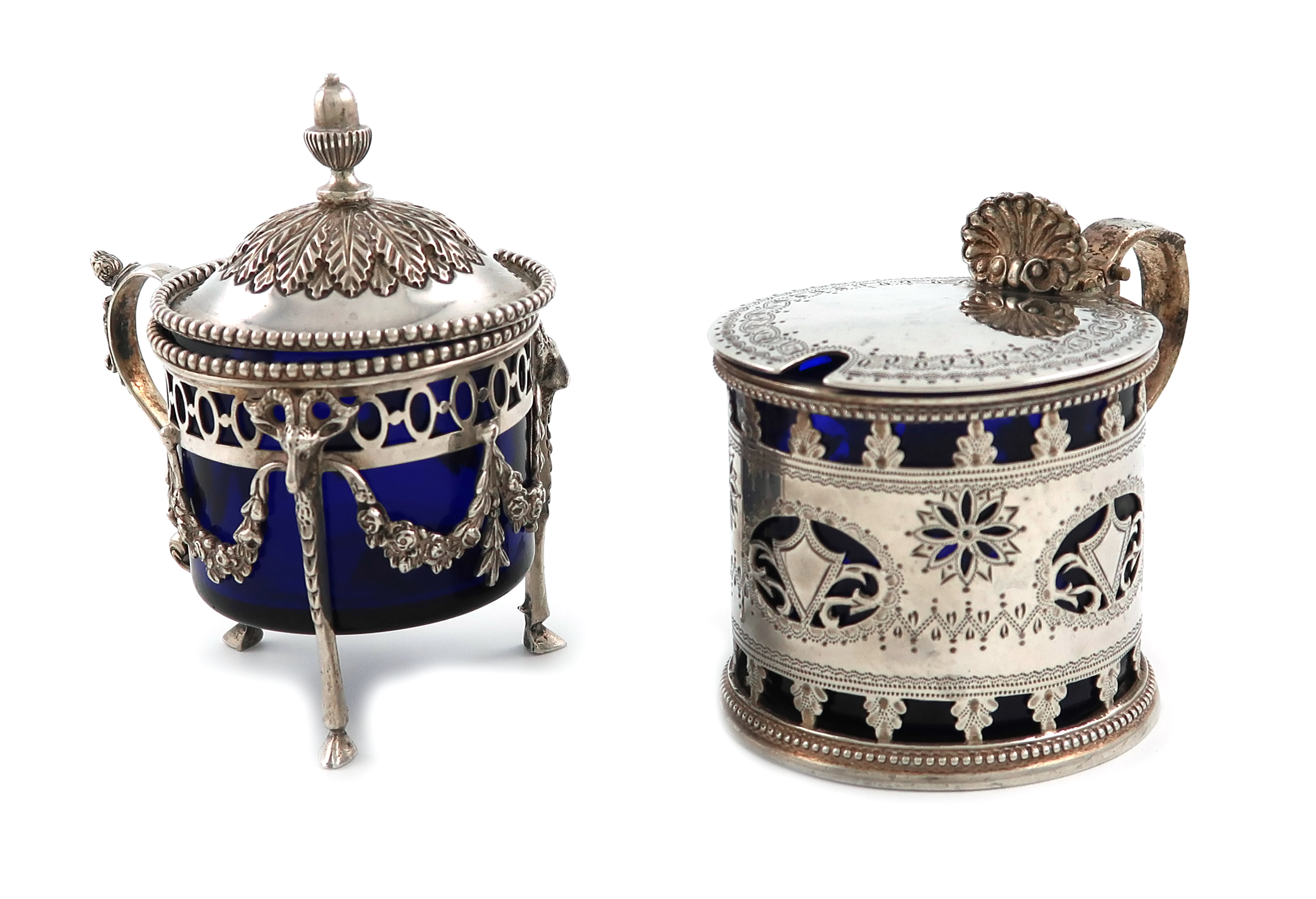 circular form, pierced and engraved decoration, scroll handle, with a blue glass liner, plus a French silver mustard pot of circular form, pierced decoration and with hanging swags, on three hoof feet, with a blue glass liner, approx. weight 4.8oz. (2)