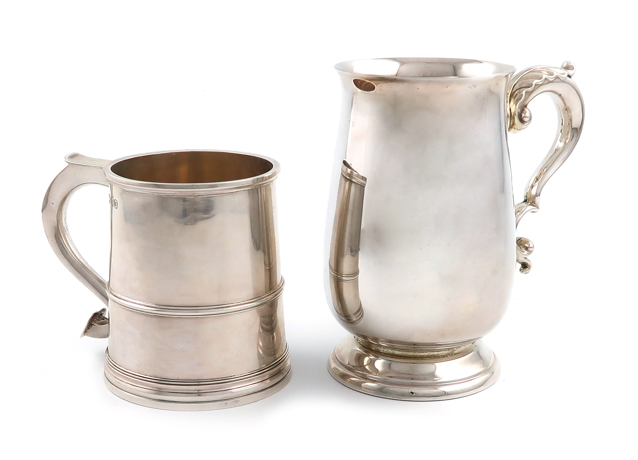 baluster form, leaf capped scroll handle, on a raised circular foot, height 13.5cm, plus another silver mug, by The Nayler Brothers, London 1939, tapering circular form, central girdle, scroll handle, height 9.5cm, approx. weight 20oz. (2)